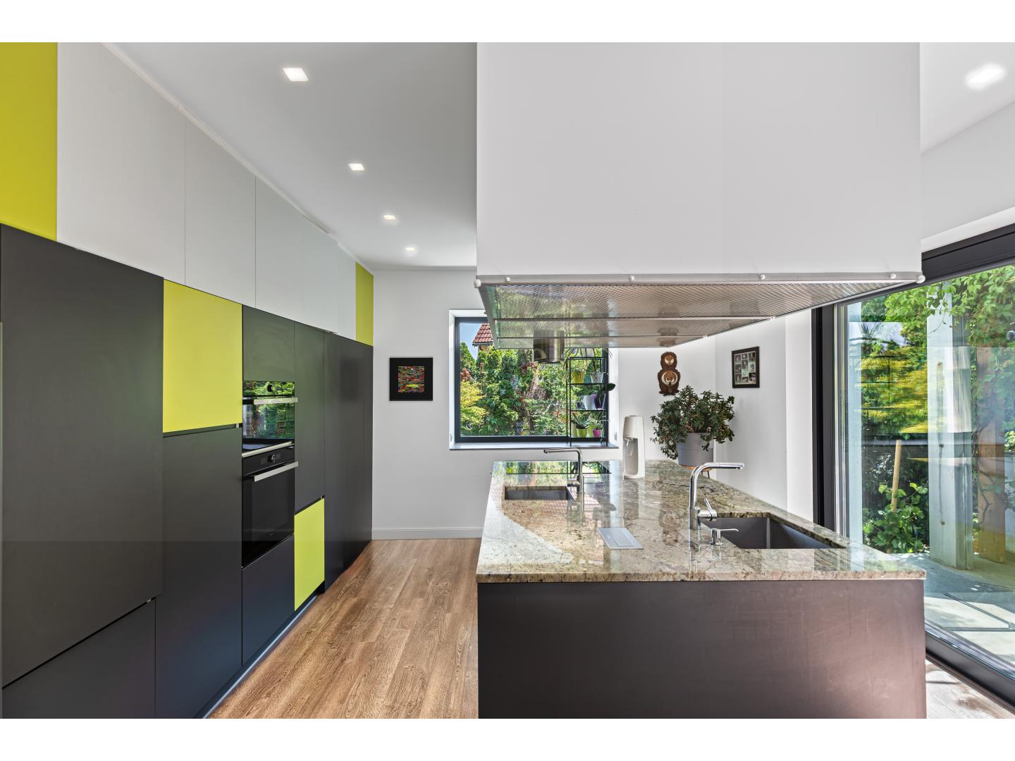 A családi ház földszintjén helyezkedik el a tágas nappali, étkező, konyha hármasa, melyek közvetlenül kapcsolódnak egy zöld növényzettel árnyassá varázsolt, körülbelül 25 négyzetméteres teraszhoz, ami remek helyszínül szolgál családi, baráti összejövetelekhez, grillezéshez, hangulatos ebédekhez, vacsorákhoz. A családi konyha minőségi gépekkel felszerelt, sok tárolási lehetőséget rejt, hatalmas főző szigete gránit pulttal borított. Az étkezőben kandalló varázsolja meghitté a téli estéket. Ezen a szinten található továbbá egy dolgozónak vagy vendégszobának használható helyiség, fürdővel.