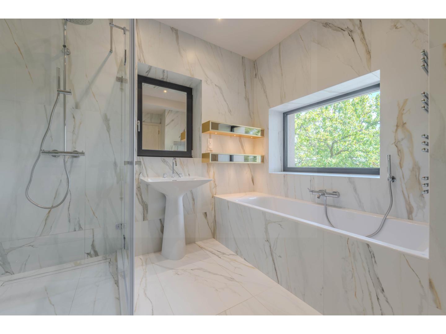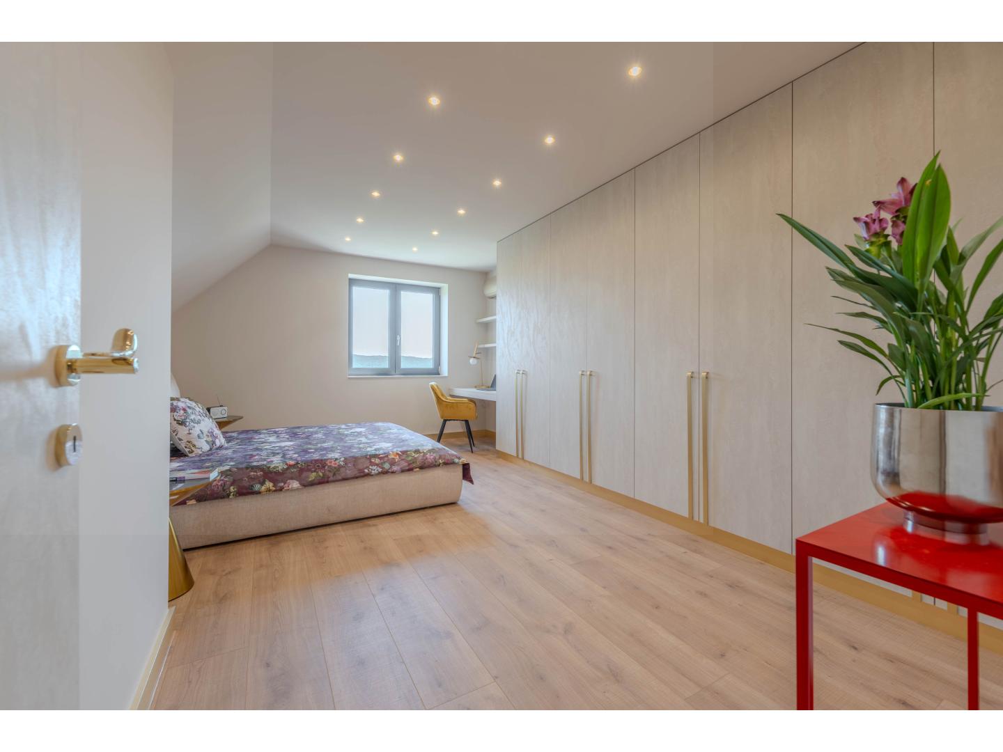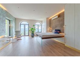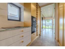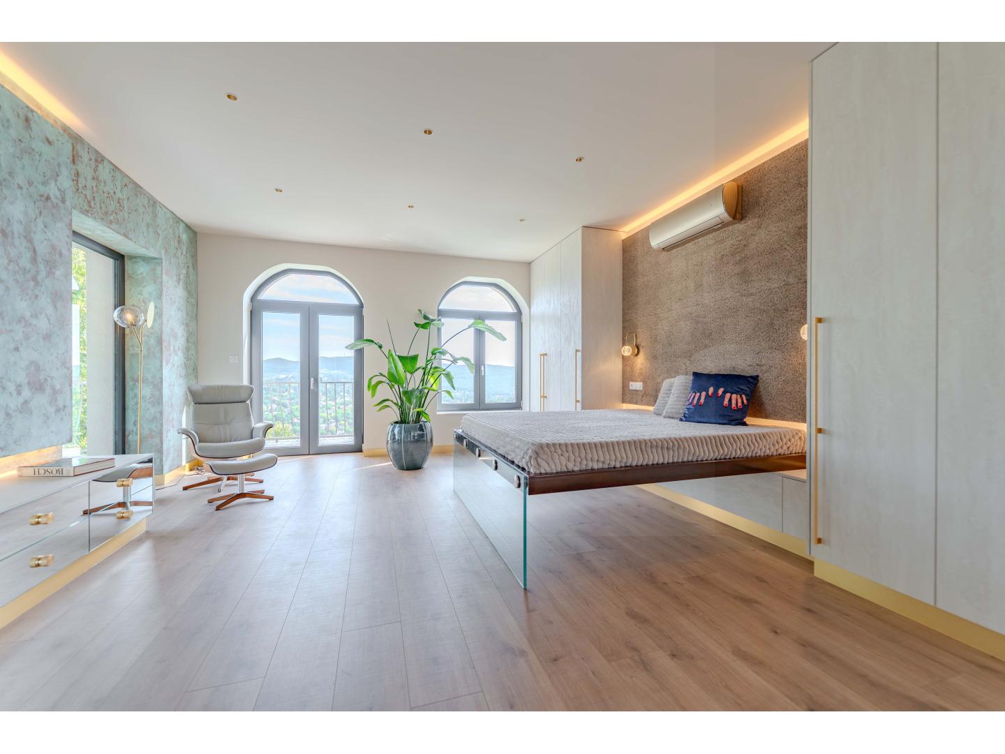 A 630 nm-es telken lévő épületet totálisan újraépítették, a magas minőség, a funkcionalitás, a kényelem és a szépség jegyében. Kezdjük kintről, az ingatlanhoz két külső parkoló is tartozik, a kényelmes lejtésű lejáró fűtött garázsba vezet, ahol két középkategóriás autó elfér. A garázsból a lakótérbe lépve először ismerkedjünk meg a nappali szinttel. A névadó helyiség az étkezővel együtt 33 nm alapterületű, látványos belsőépítészeti megoldásokkal , esztétikai és komfort szempontból is jól eltalált, természetesen full gépesített konyhával. Külön wc, illetve háztartási helyiség van még ezen a szinten. A nappaliból kilépve egy 100 m-es édenkert vár minket, selymes, ápolt gyeppel, jacuzzival, hideg-meleg vizes zuhannyal, kerti grillel és a kertből nézve is mellbevágó zöldpanorámával. Ha sikerült elszabadulni a látványtól, nézzük meg a szülői hálószintet: hatalmas hálószoba, egyedi építésű, lebegő hatást keltő ággyal, kádas és zuhanyzós, gyönyörű fürdővel, terasszal, ahonnan még egy fokkal szebb a kilátás. A tetőtérben két nagyobb és egy kisebb szoba található, valamint egy duplamosdós, kádas fürdő és infraszauna. Minden szinten padlófűtés, 3 rétegű, betörésgátló ablakok, klíma, Sinclair hőszivattyú, magas minőségű burkolatok, szaniterek, háztartási berendezések.