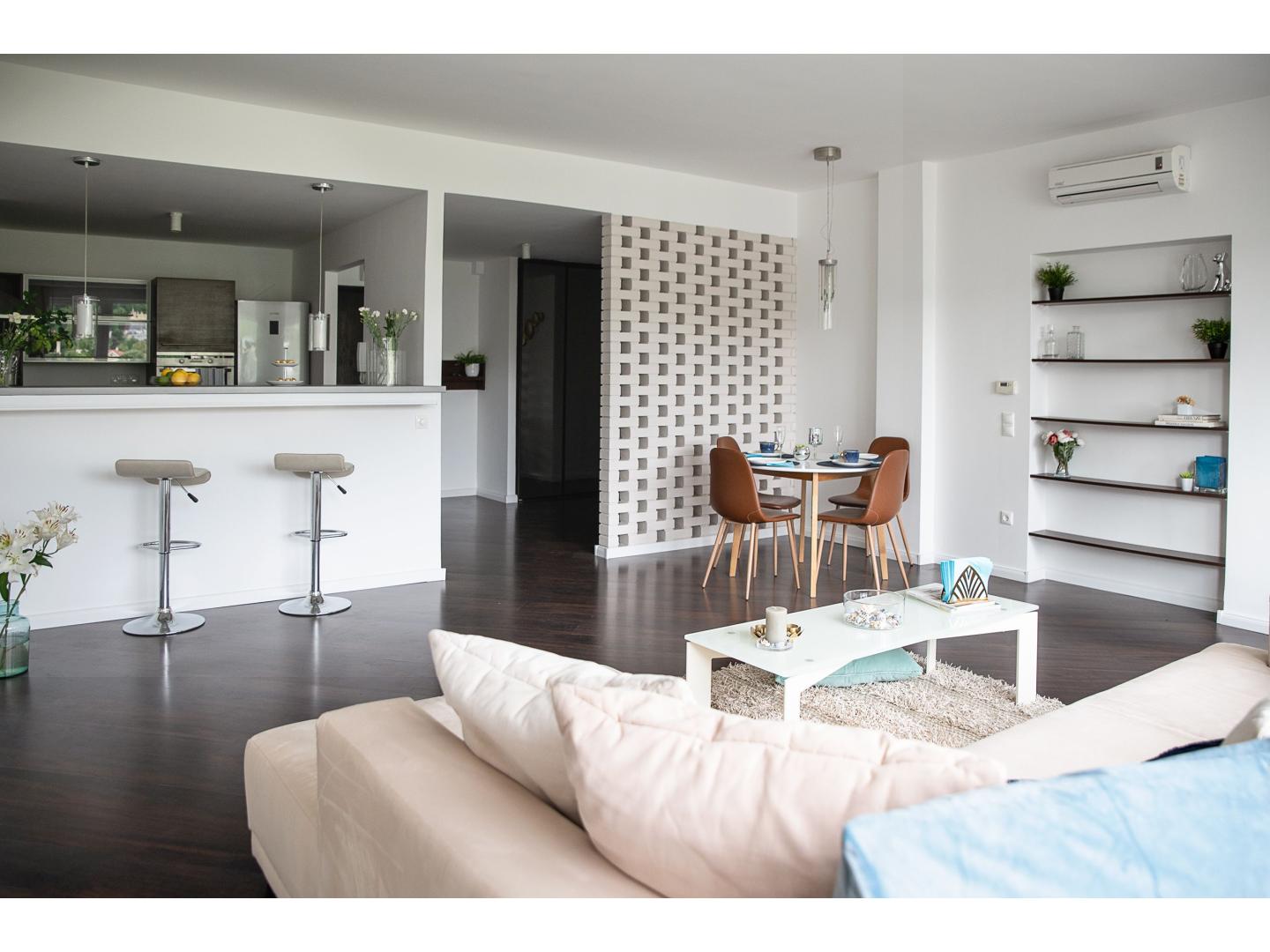 Az otthon mintegy tizenöt évvel ezelőtt teljeskörű, gondosan megtervezett felújításon esett át, melynek során a modern funkcionalitás és a Bauhaus építészeti esztétika tökéletes összhangba került egymással. A minőségi anyaghasználat, a visszafogott, de elegáns színvilág, valamint az átgondolt részletek a kortárs igényekhez igazodva őrzik a ház eredeti szellemiségét.
