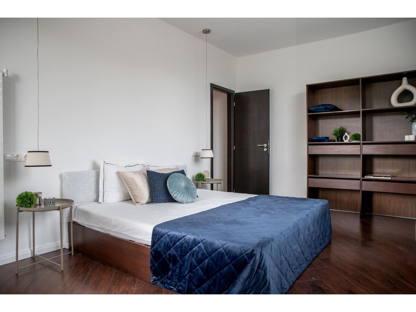 A lakás tágas, kelet–dél–nyugati fekvésének köszönhetően egész nap napfényben úszik, ablakain keresztül a Budai-hegyekre nyíló körpanoráma tárul elénk. A hatalmas, egybefüggő amerikai konyhás nappali a lakás központi élettere, ahol a térszervezés harmóniája és a természetes fény tökéletes egyensúlya uralkodik. Innen léphetünk ki a 8 négyzetméteres loggiára. A két külön nyíló hálószoba a privát élettér nyugalmát biztosítja, míg a praktikus alaprajz lehetőséget ad a lakás akár négyszobássá való átalakítására is. A fürdőszoba mellett kialakított mosókonyha helyiség kényelmes megoldást kínál a mindennapokra.
