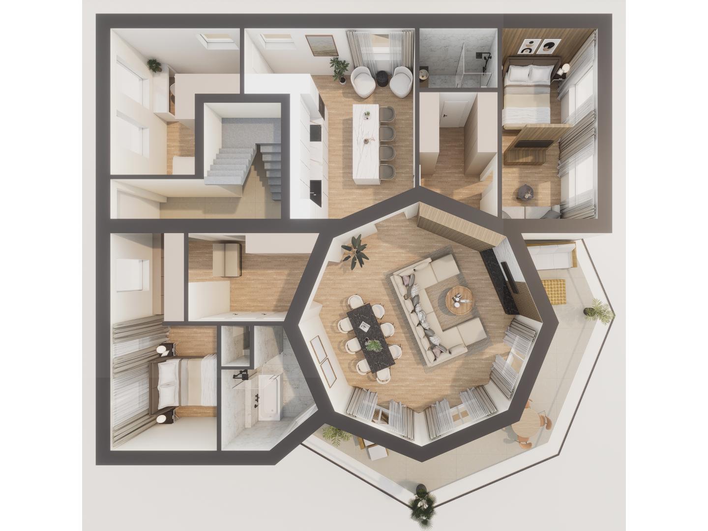 A középső szinten található, 146 nm nettó alapterületű lakás beosztását tekintve, nappali + 3 hálószobás elrendezésű, két fürdőszobával plusz két járható gardróbbal, amelyhez egy 26 m² területű panorámás terasz tartozik.