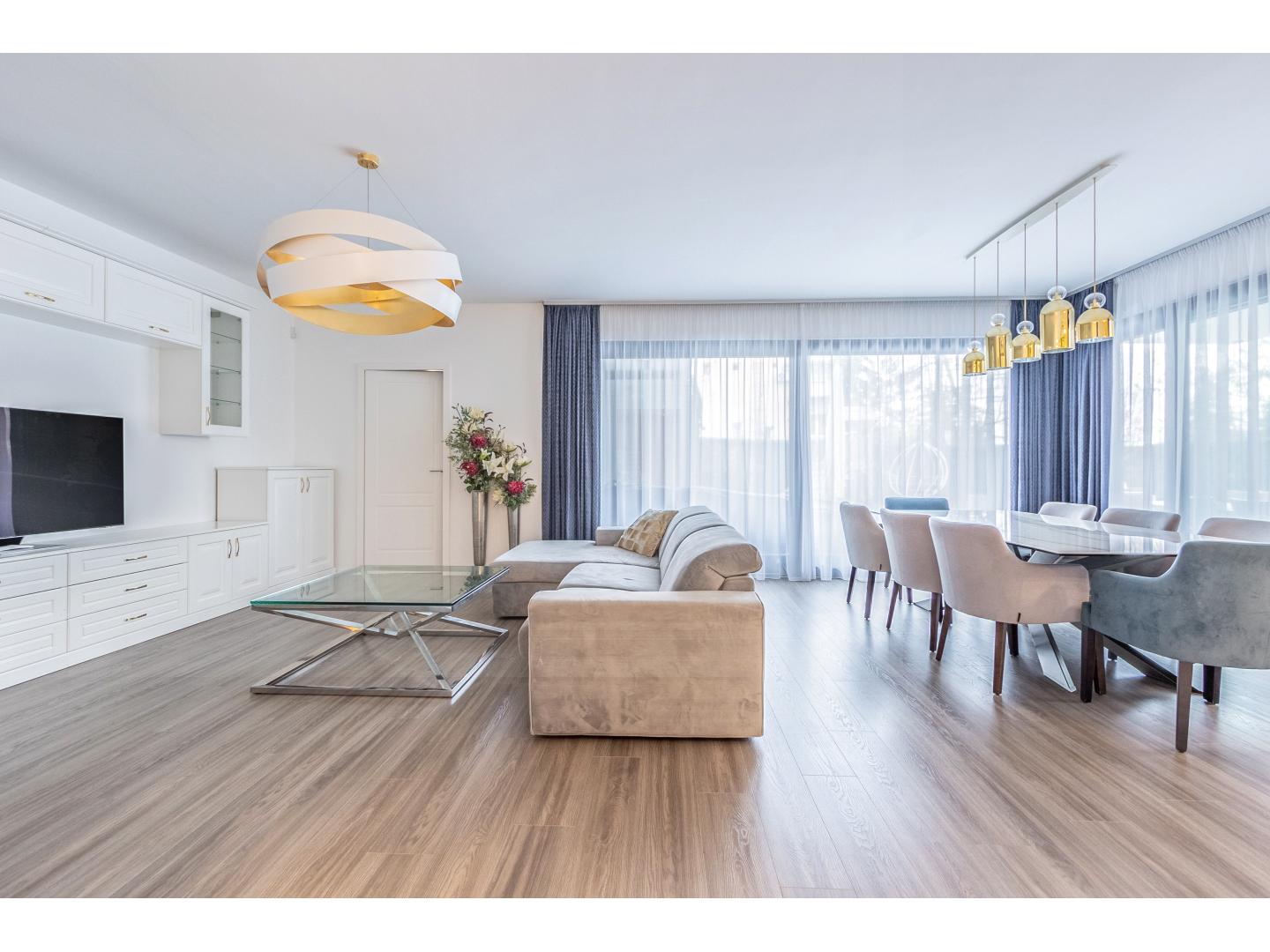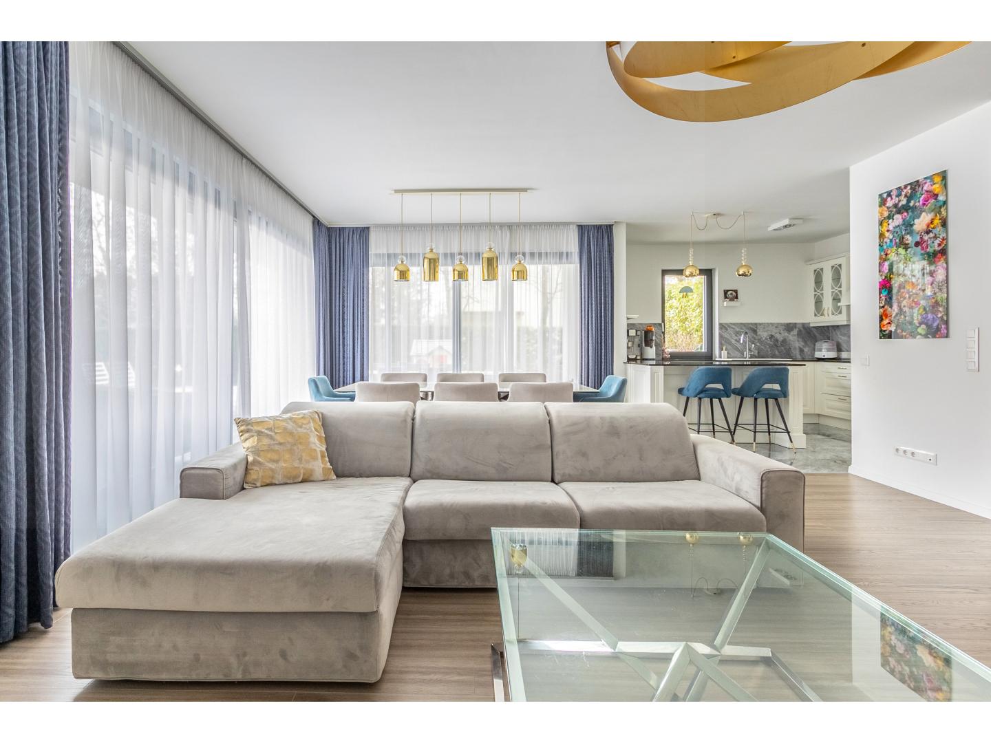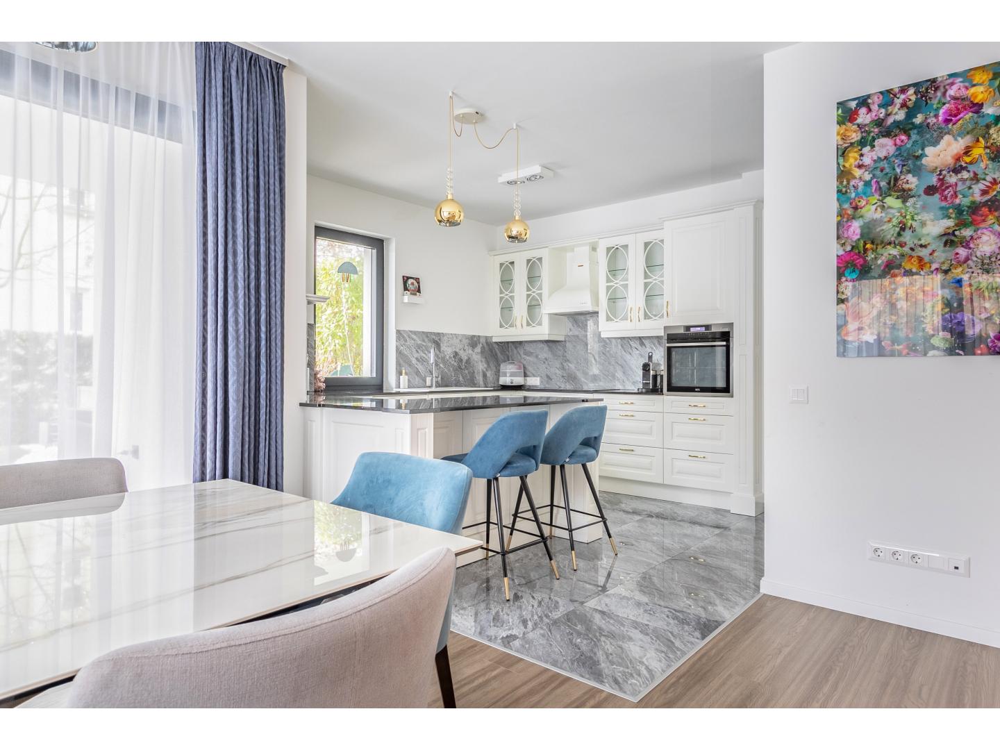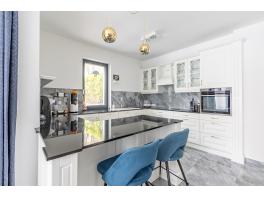 Elrendezése ideális család számára: a közösségi térben tágas (44 nm-es), nappali–étkező, a részben szeparált, világos, ablakos, étkező pulttal épített konyhával, gránit munkalappal, klasszikus fehér frontokkal és teljes körű gépesítéssel, kényelmesen használható toronyba épített sütővel.