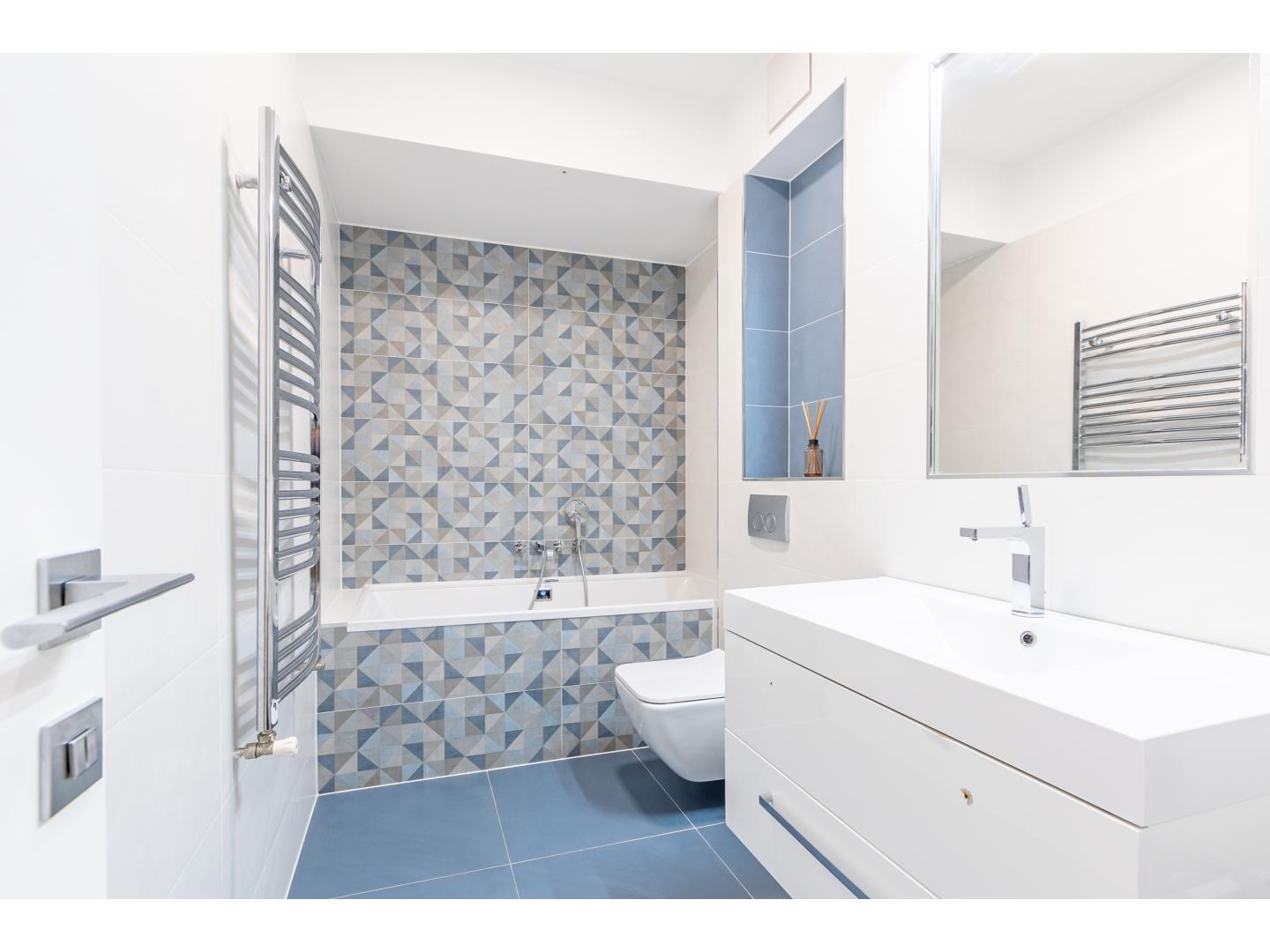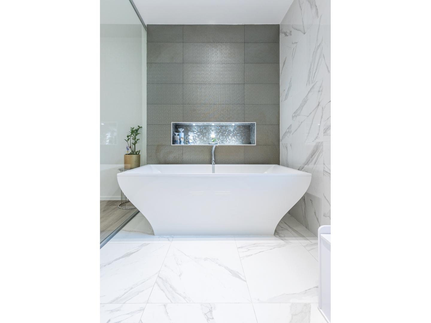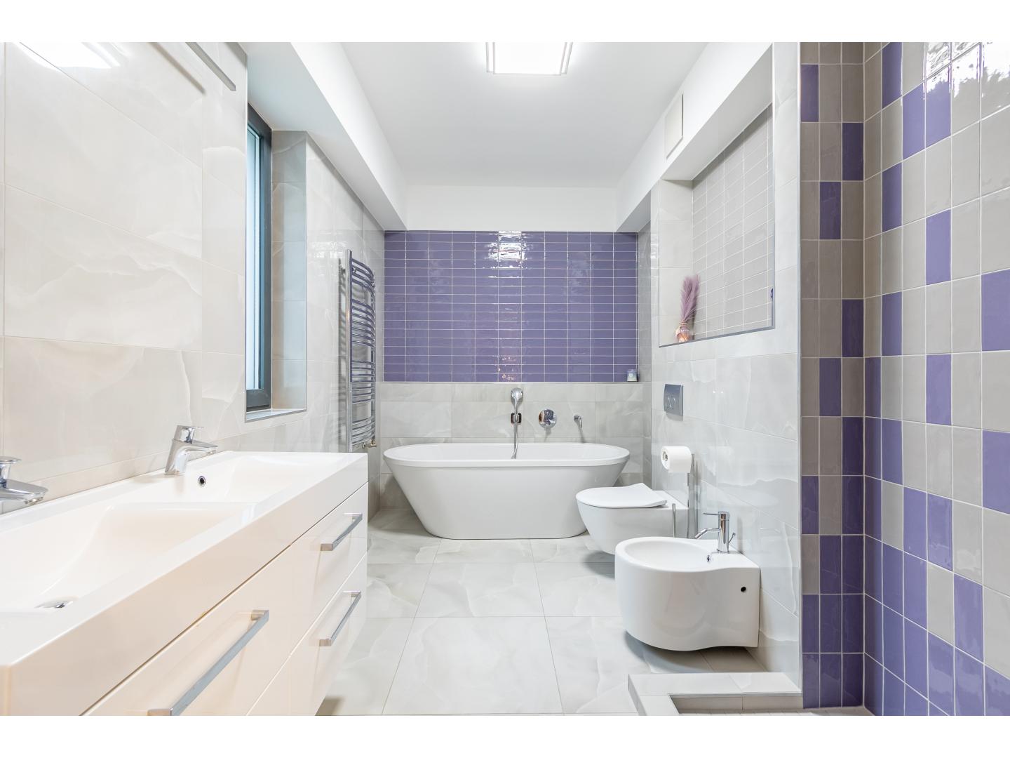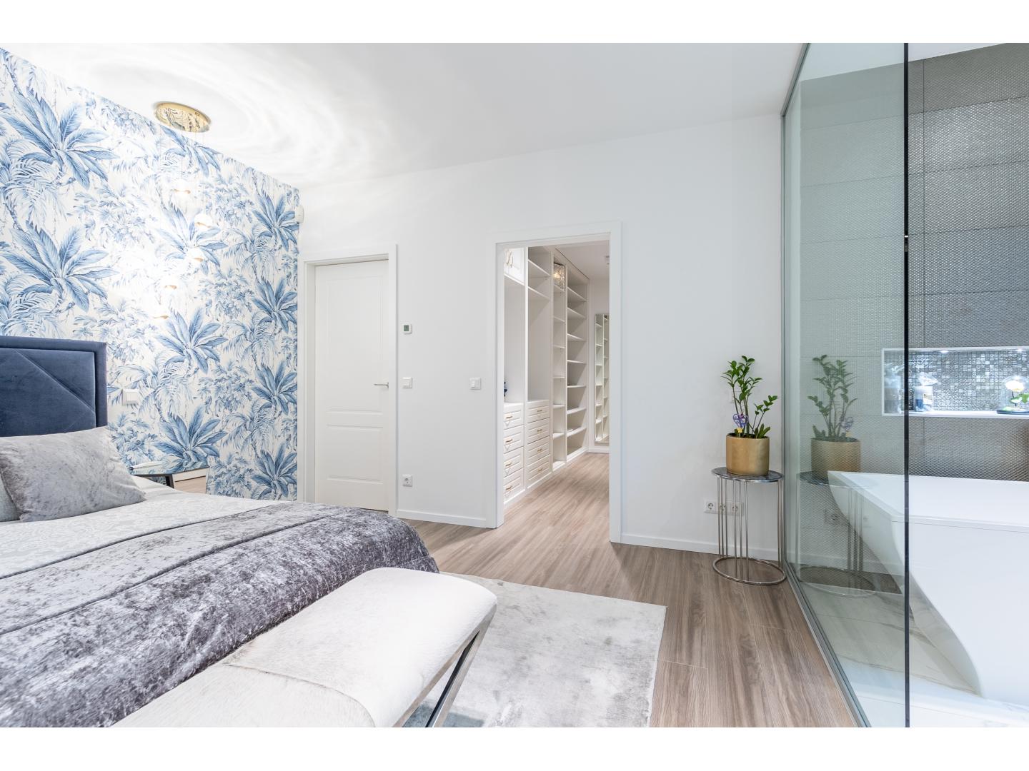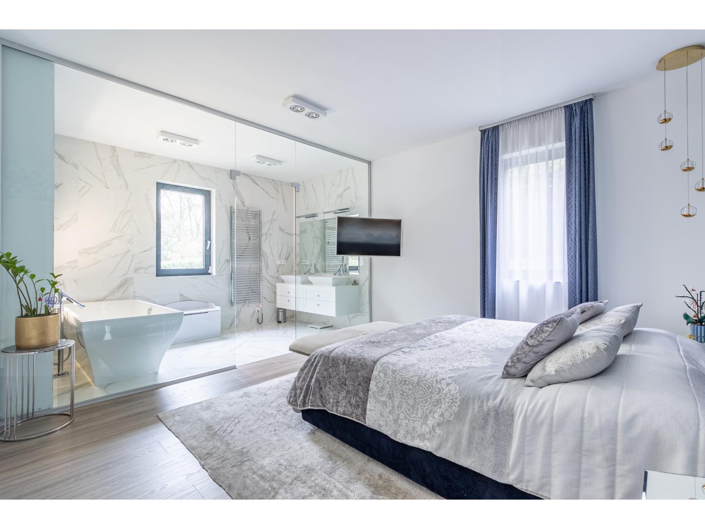Itt kapott helyet egy nagyméretű hálószoba saját fürdőszobával, dupla mosdóval és szabadon álló káddal.