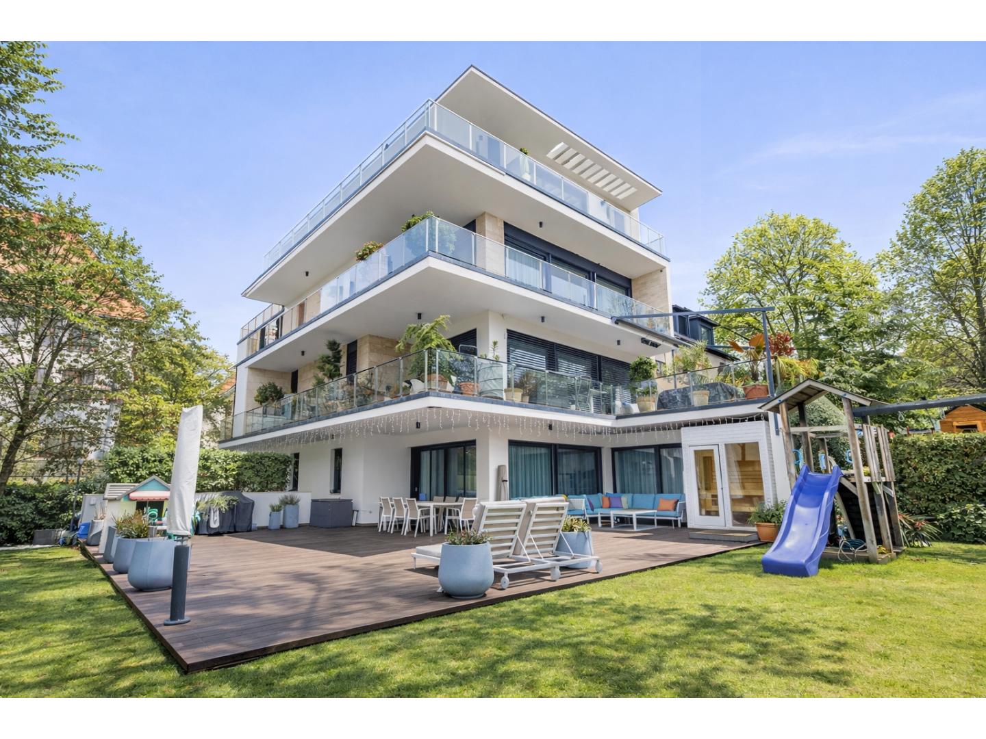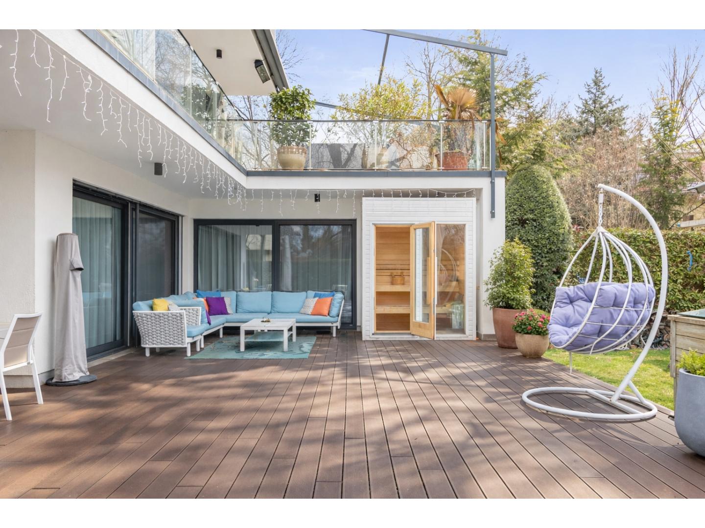 A földszinti, részben fedett terasz valódi szabadtéri nappali: 12 személyes étkezőasztal, kültéri lounge, finn szauna, napozóágyak, függőfotel és gyermekjátszótér teszi teljessé az élményt.