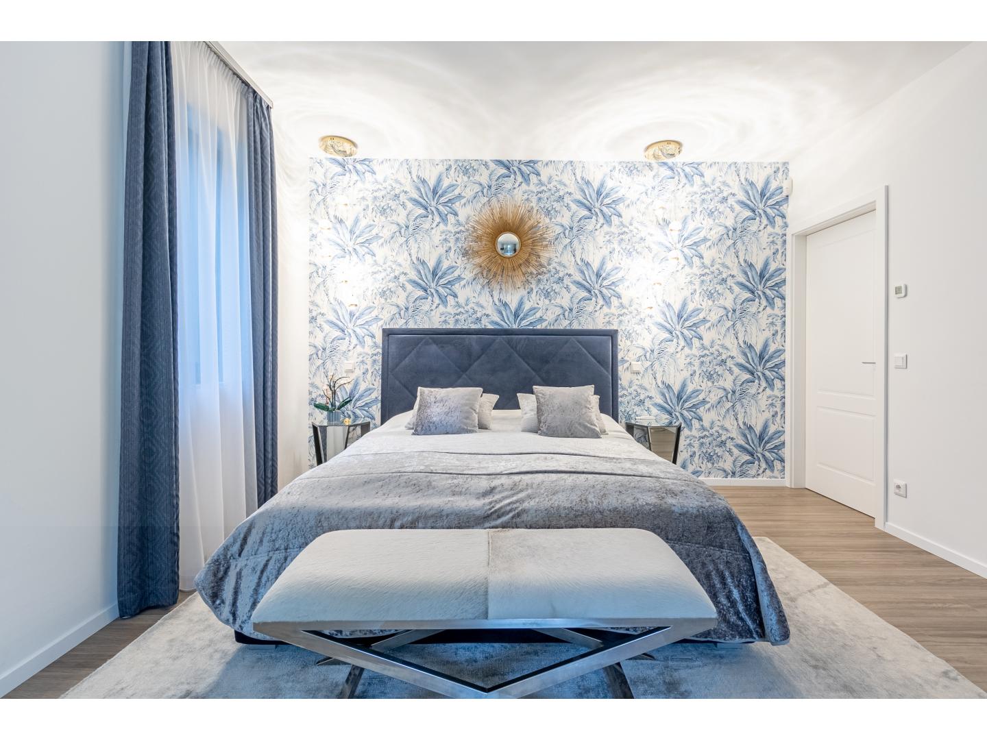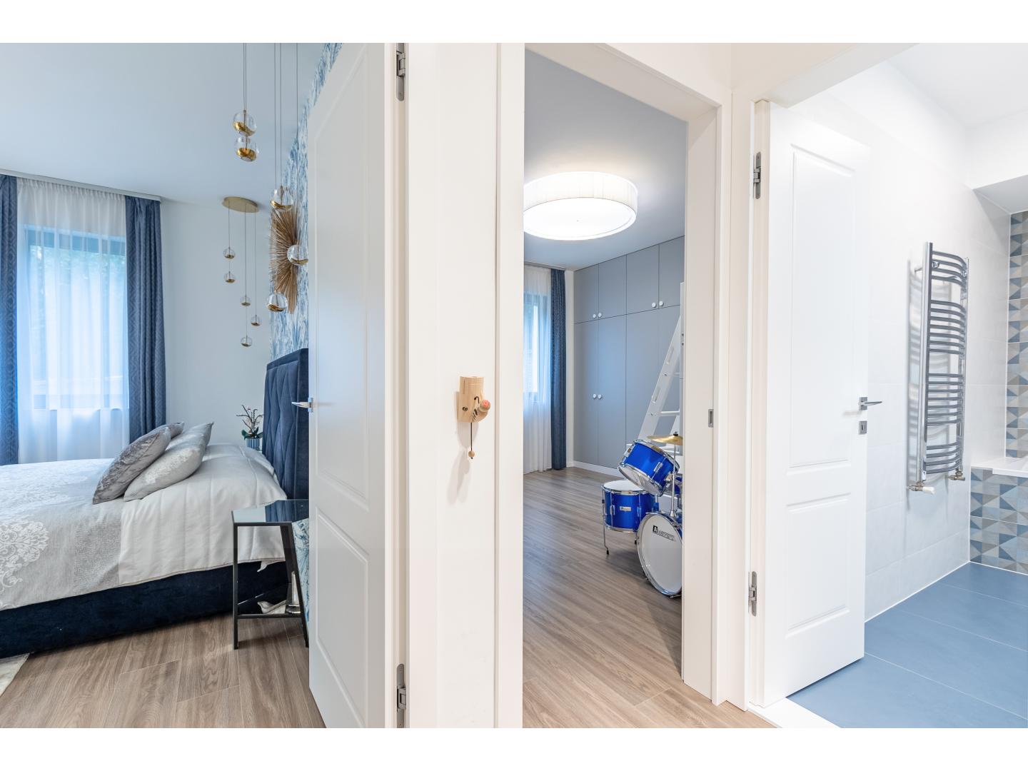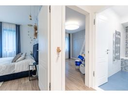 A közlekedőből nyílik további egy hálószoba, és egy kádas fürdőszoba, valamint a szülői apartman - ami egy egyedi megjelenésű -, üvegfallal leválasztott látványfürdővel, design térkáddal, dupla mosdóval, illetve járható gardróbbal is rendelkezik.