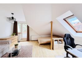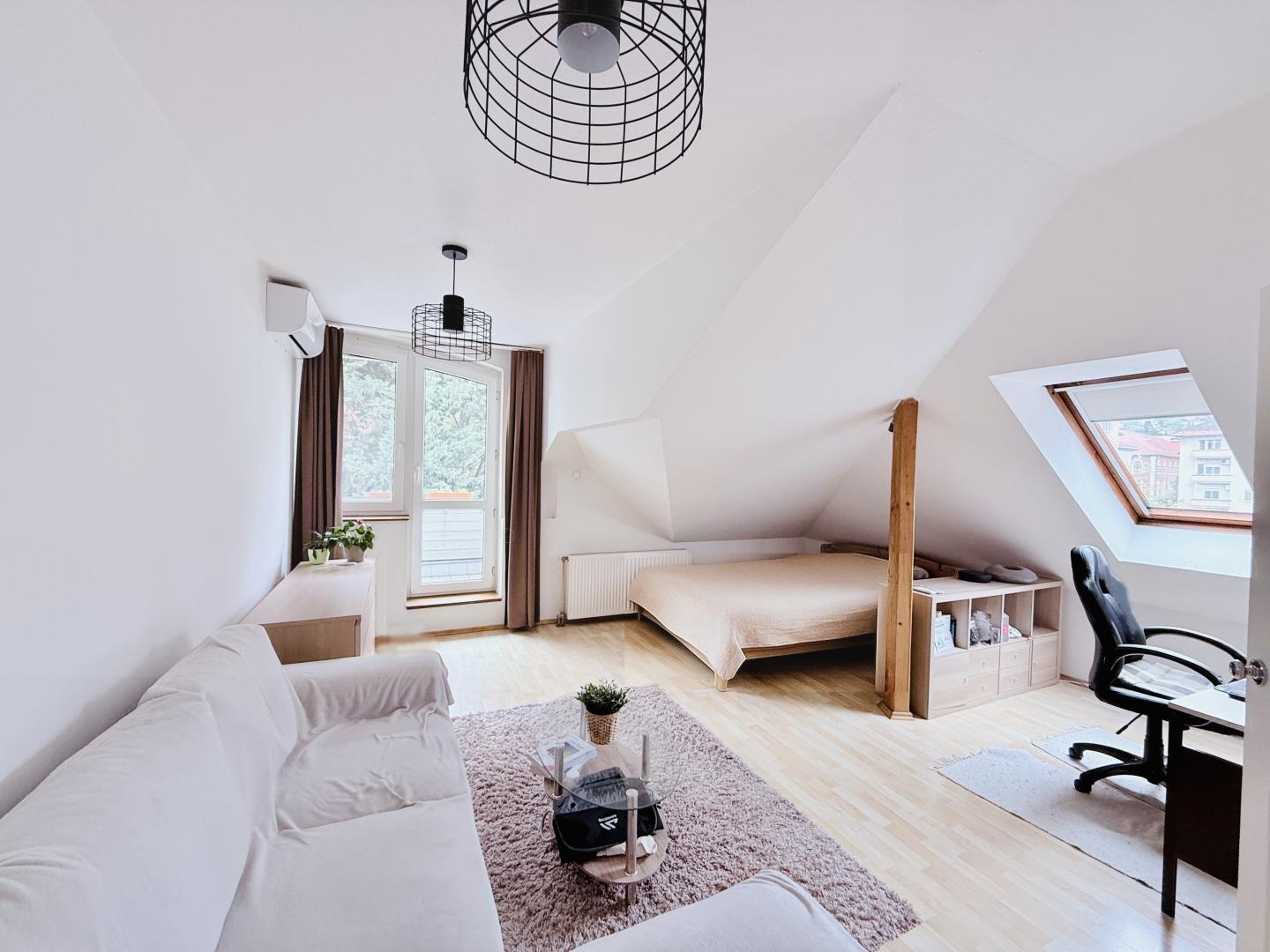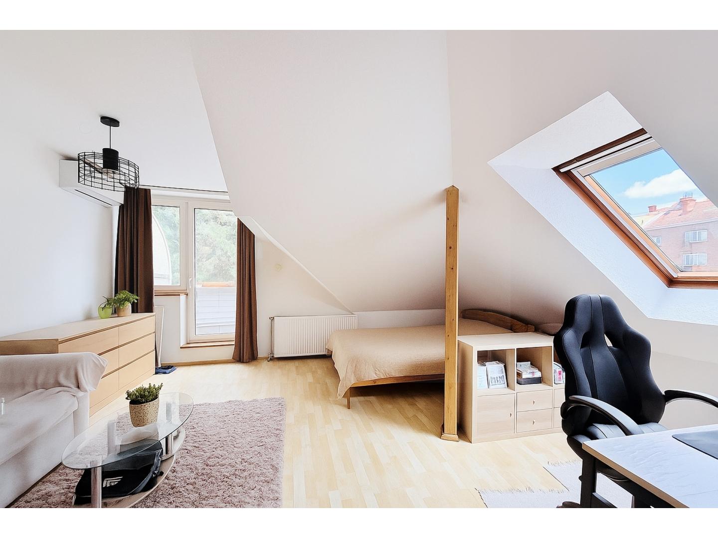 A szoba déli irányban erkélyajtóval és ablakkal, a nyugati irányba tetőtéri ablakkal rendelkezik, így egész nap napos, világos.