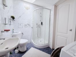 A fürdő ablakos, nagyon világos, zuhanyzóval, WC-vel, kézmosóval és mosógép kiállással.