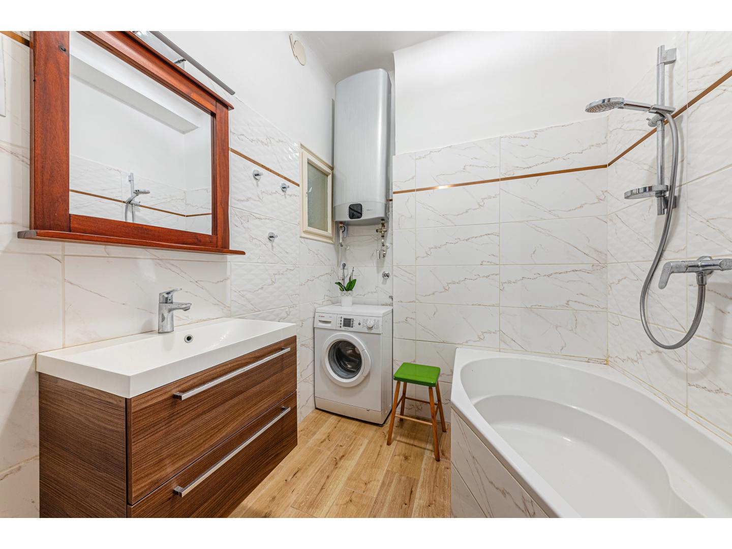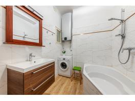 Az ablakos fürdőszobában kényelmes méretű kád, fiókos mosdószekrény és energiatakarékos villanybojler található.