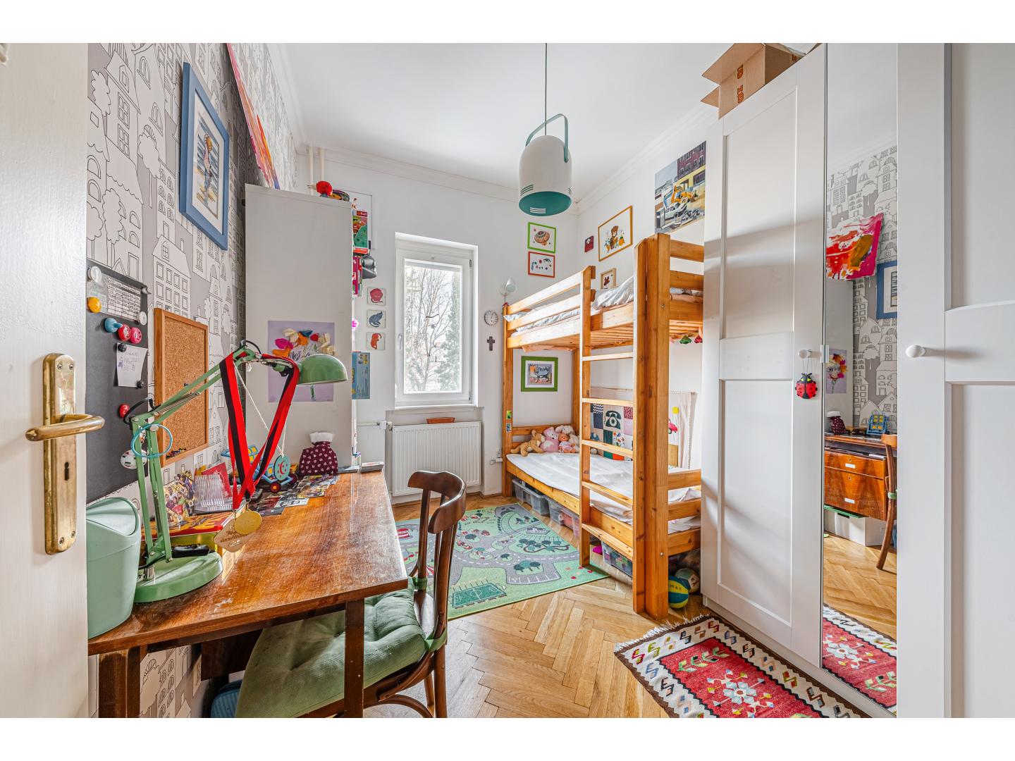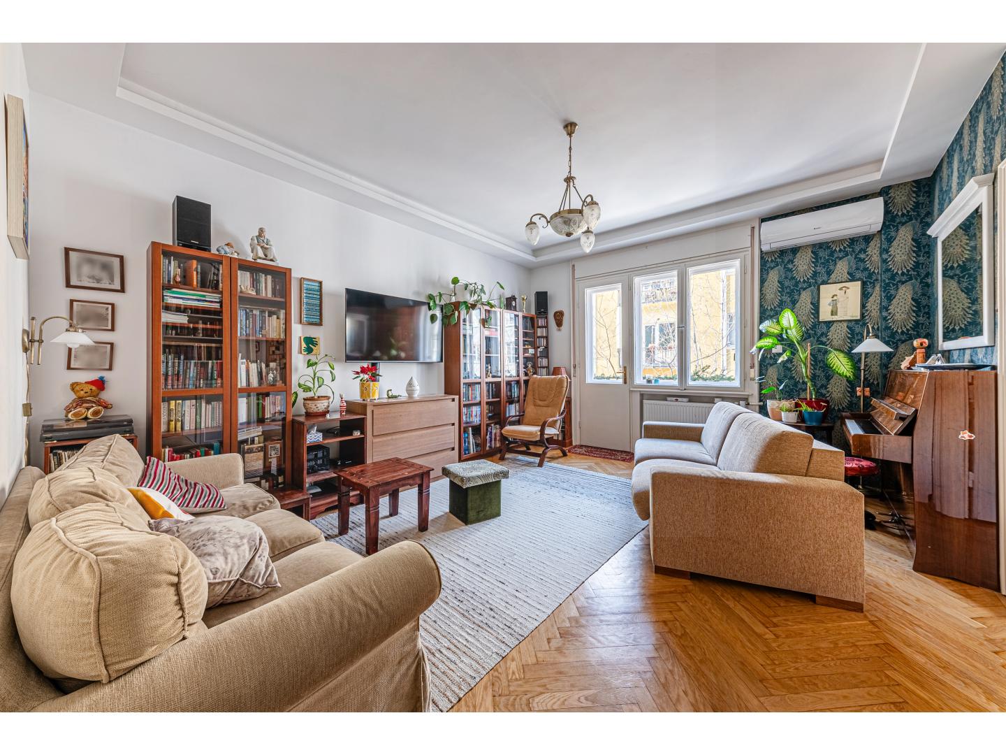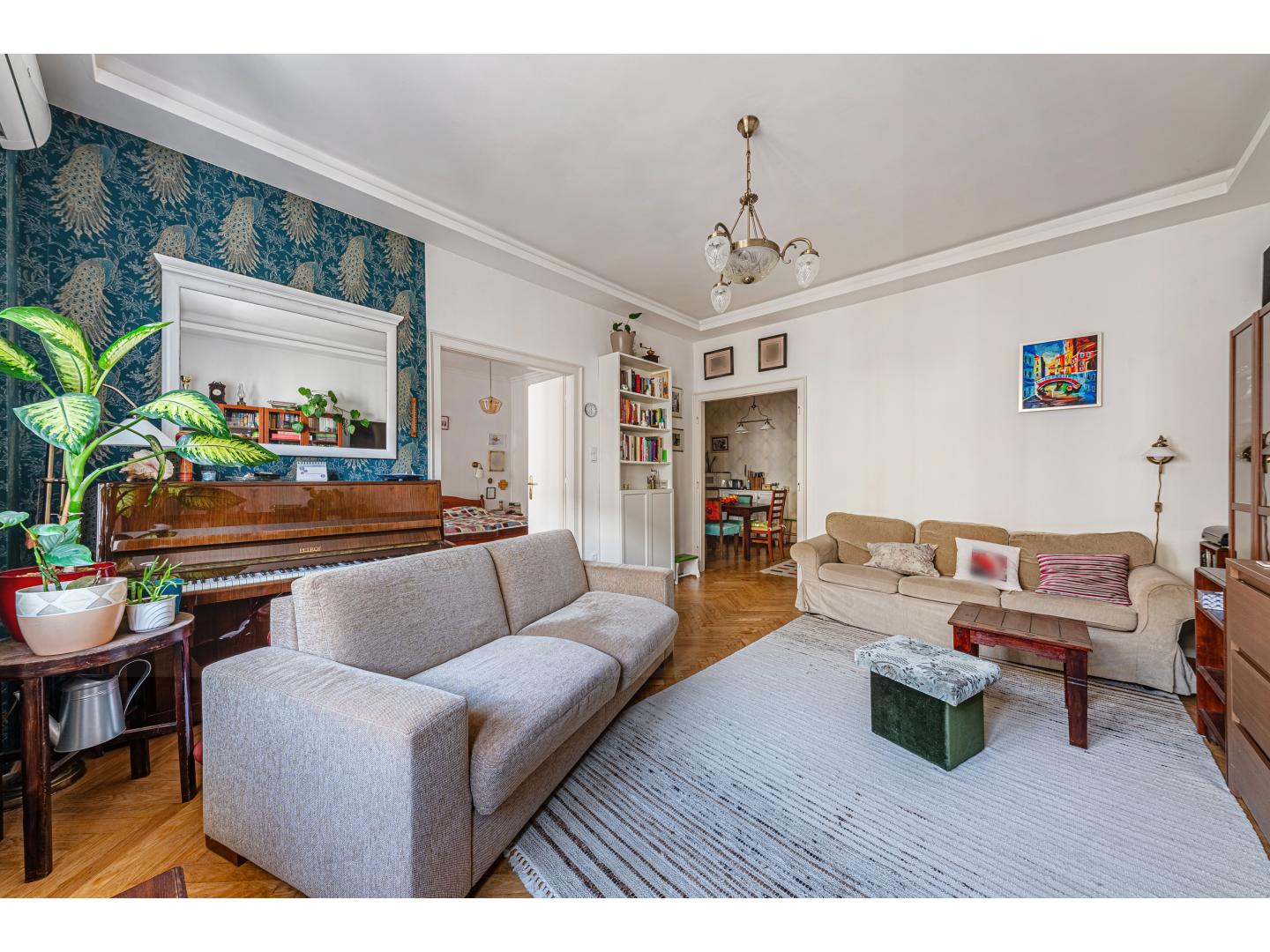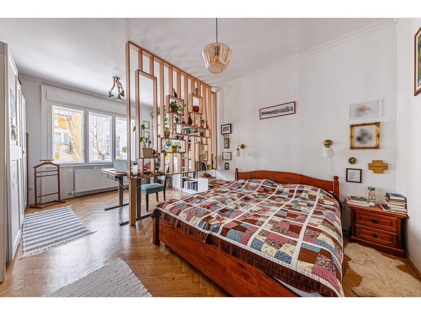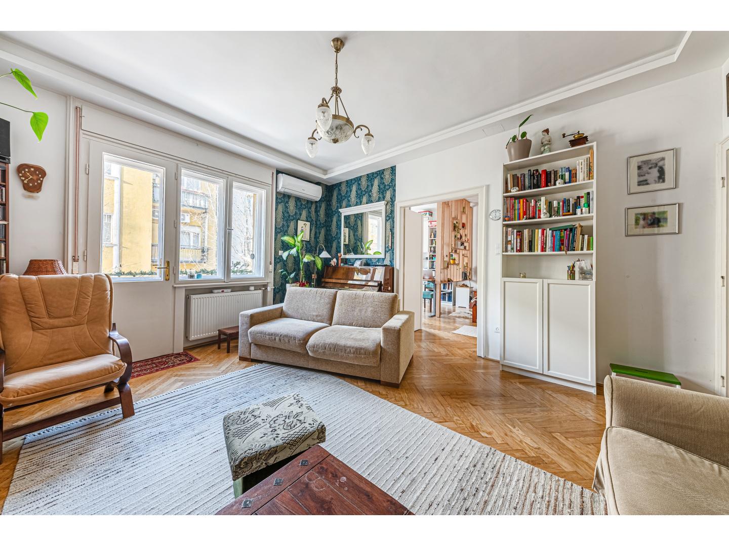 A lakás a második emeleten található, klasszikus elrendezése tágas, jól arányos tereket biztosít.