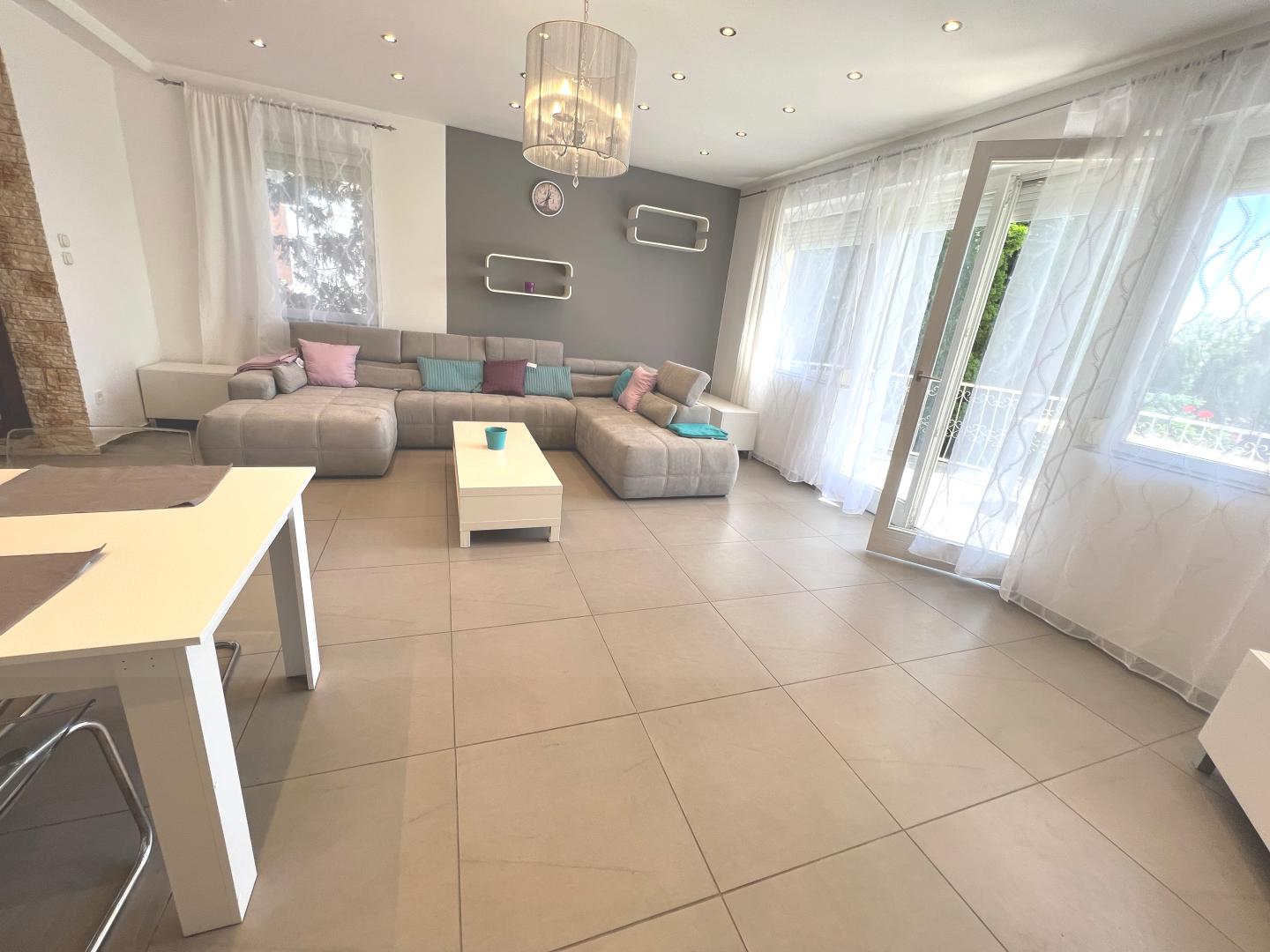 A 620 nm-es, szépen gondozott, örökzöldekkel beültetett, parkosított telken elhelyezkedő - folyamatosan felújított/karbantartott - épületben szintenként egy - déli tájolású, napsütötte - lakás került kialakításra, az 1. emeleten elhelyezkedő lakás 85 nm-es, amerikai konyhás nappali + 2 szoba, 2 fürdőszoba, gardrób elosztású, nagy teraszkapcsolattal rendelkezik.