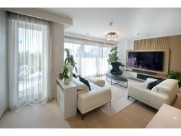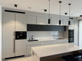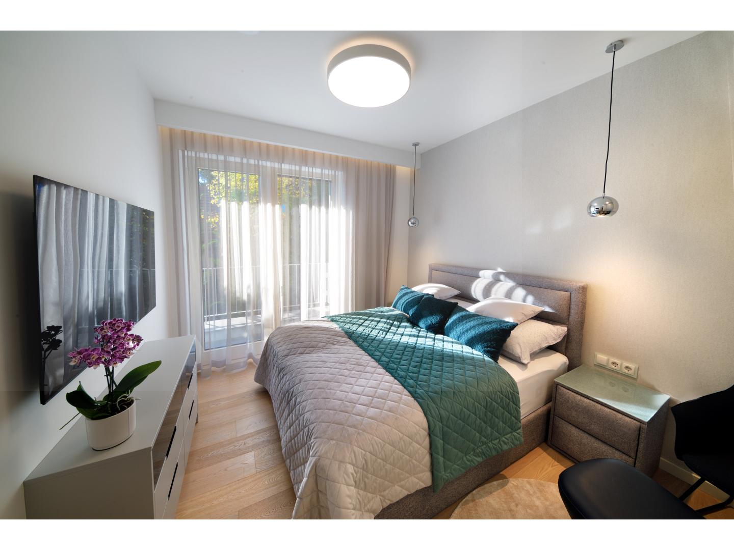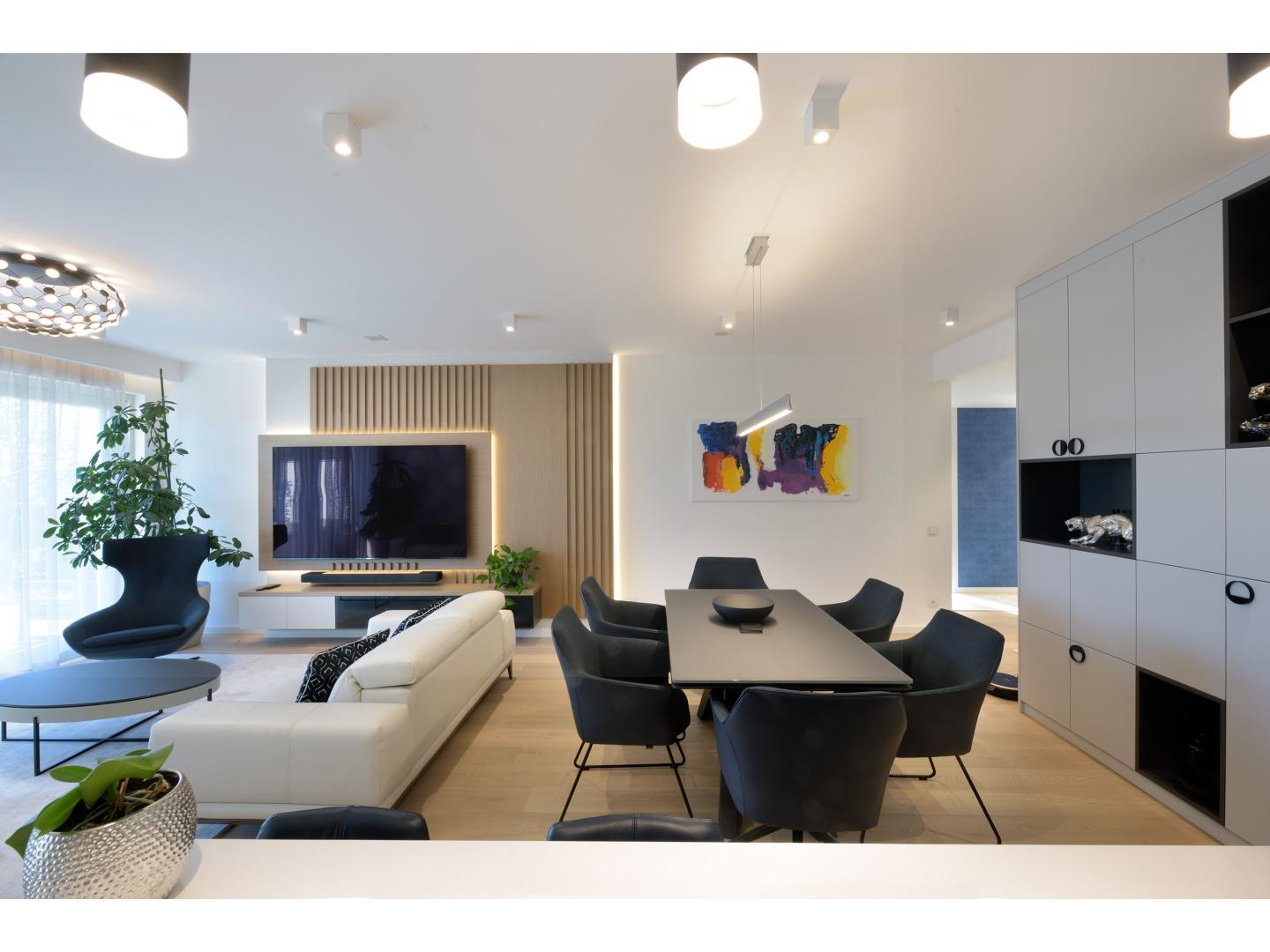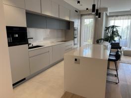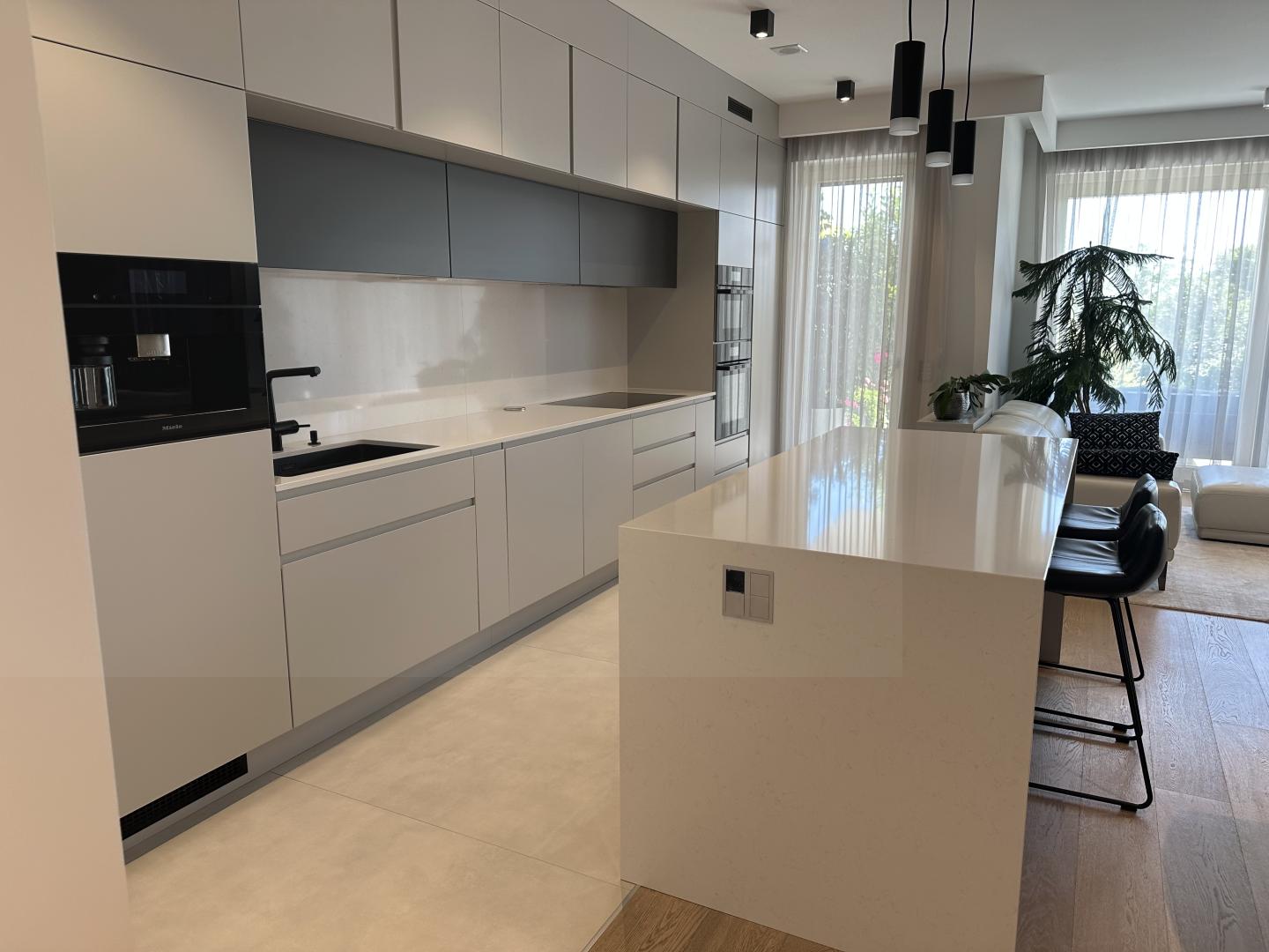 A lakás belső tereiben a tágas, 50 m²-es amerikai konyhás nappali uralja a teret, amely a kertre néző, hatalmas üvegfelületeknek köszönhetően egész nap fényárban úszik.