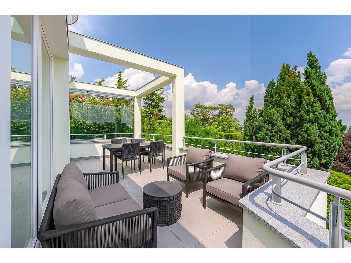 165 nm nettó lakóterületén felül tartozik hozzá két nagyméretű, összesen 55 nm alapterületű, nagyon jól használható, városi panorámás (Gellért-hegy, Erzsébet-híd, Pesti oldal mind a látkép része) irányába néző terasz.