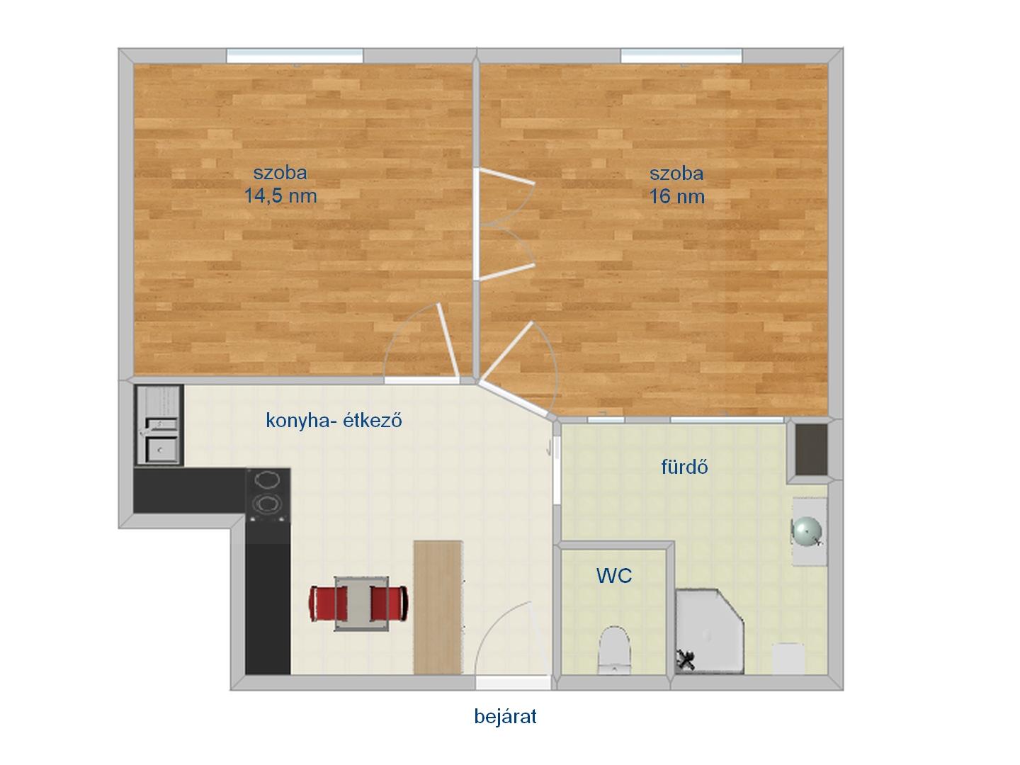 • 2 külön nyíló szoba, étkezős konyha, zuhanyzós fürdő, WC
