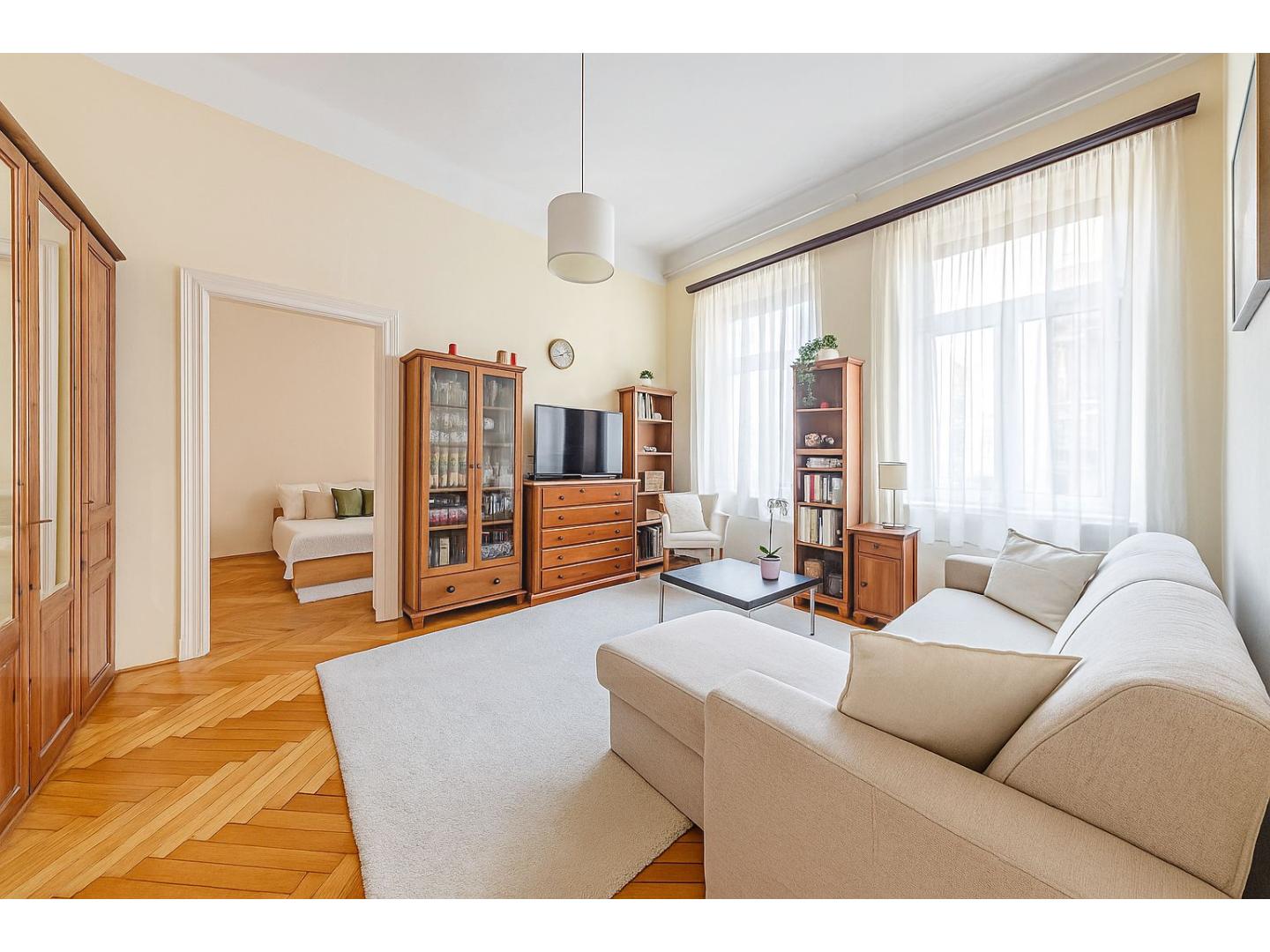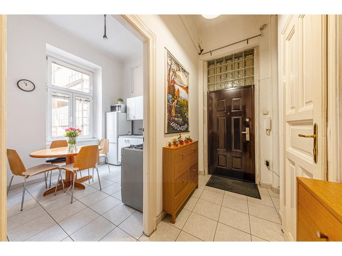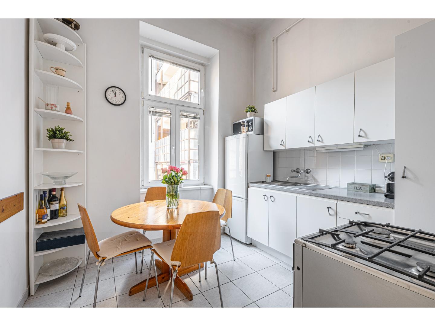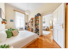 Az 1930-as években épült társasház rendezett lépcsőházakkal, zárt udvarral és jó lakóközösséggel őrzi a korszak eleganciáját. A harmadik emeleten található lakás 3,85 méteres belmagassága a tágasság érzetét adja, világos tereit pedig kellemes arányok és jól kialakított alaprajz határozzák meg. A két nagy ablakos nappali és a különálló hálószoba mellett egy barátságos étkező-konyha, kádas fürdőszoba, külön mellékhelyiség és előszoba alkotják a lakás harmonikus egységét.