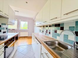 A konyha gépesített, funkcionális, világos, az étkező a nappalival egy térben, mégis attól szeparáltan helyezkedik el.