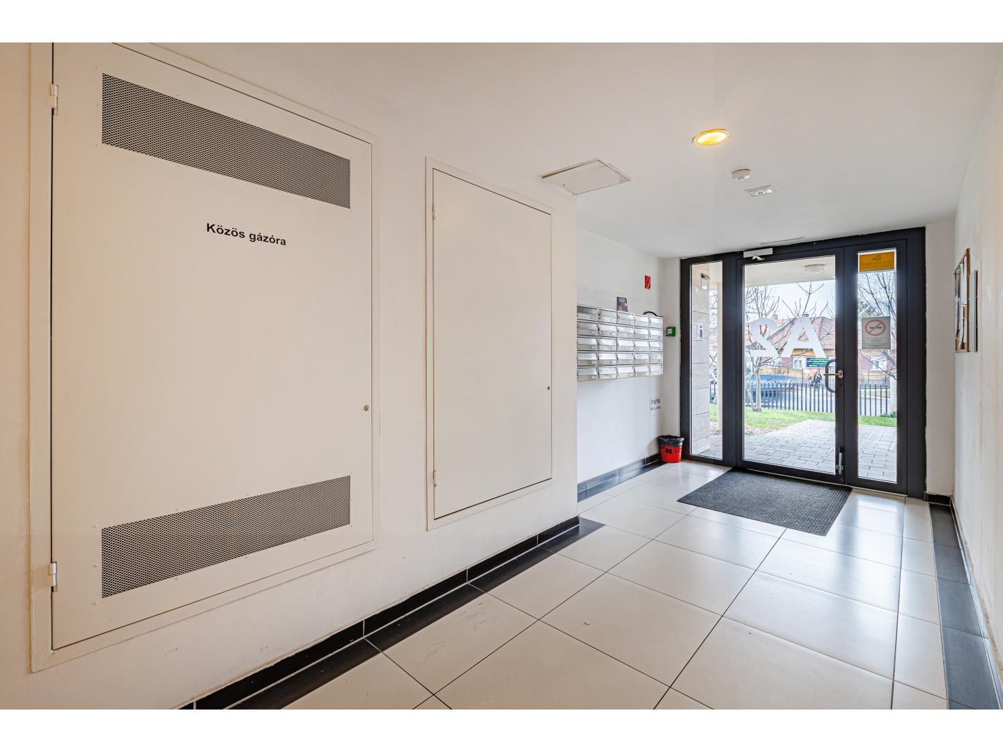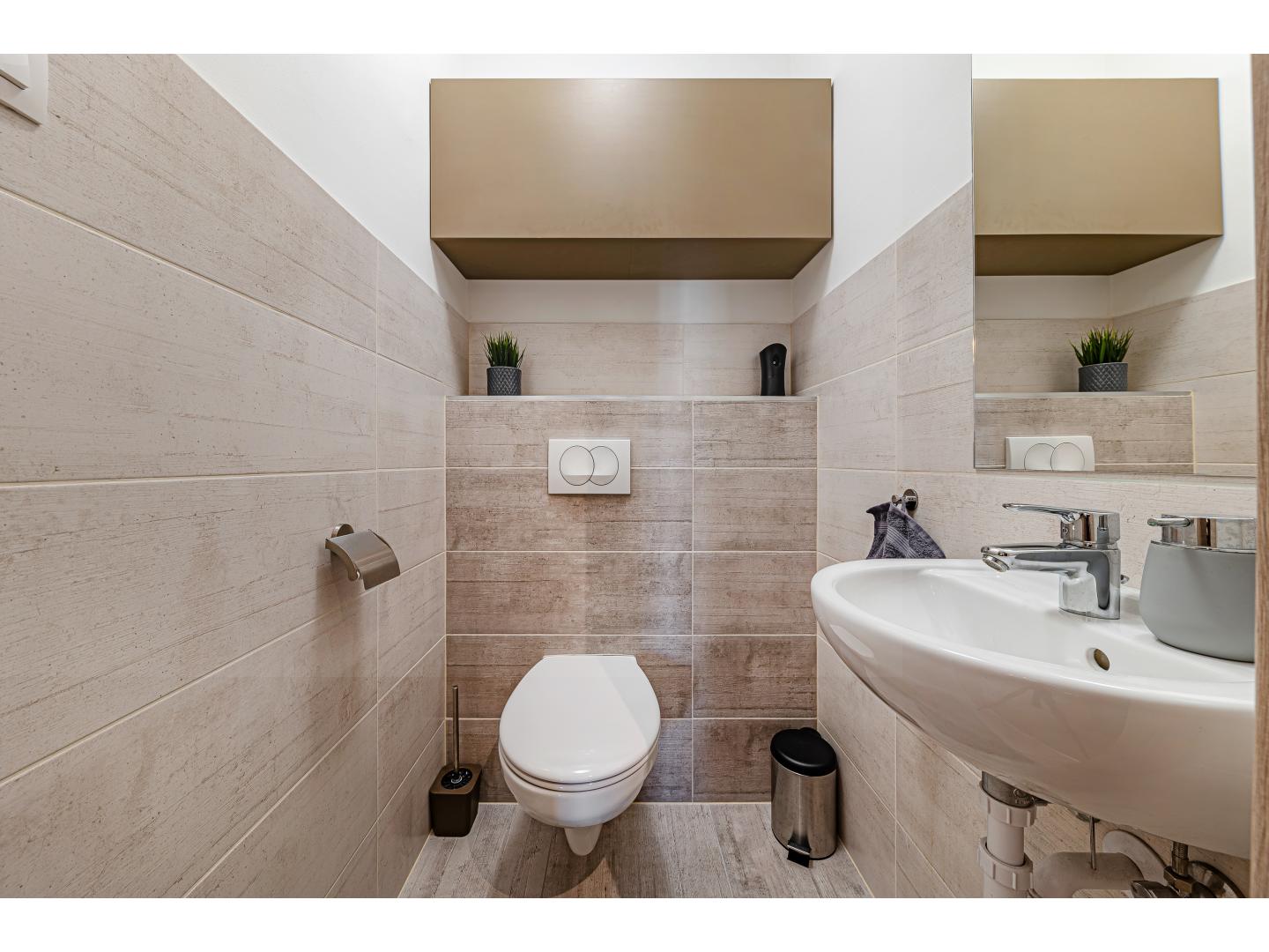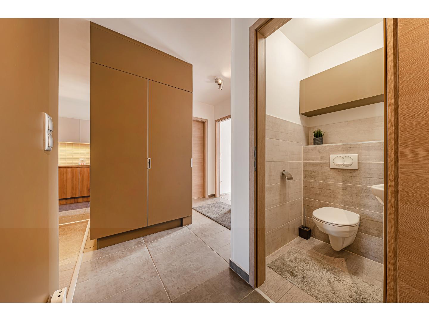 A saját gardróbszekrénnyel rendelkező előszobából külön vendégmosdó is elérhető, ami a mindennapi kényelmet tovább emeli.