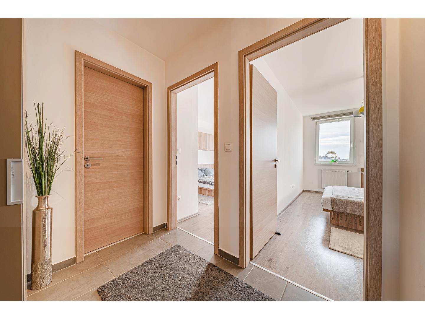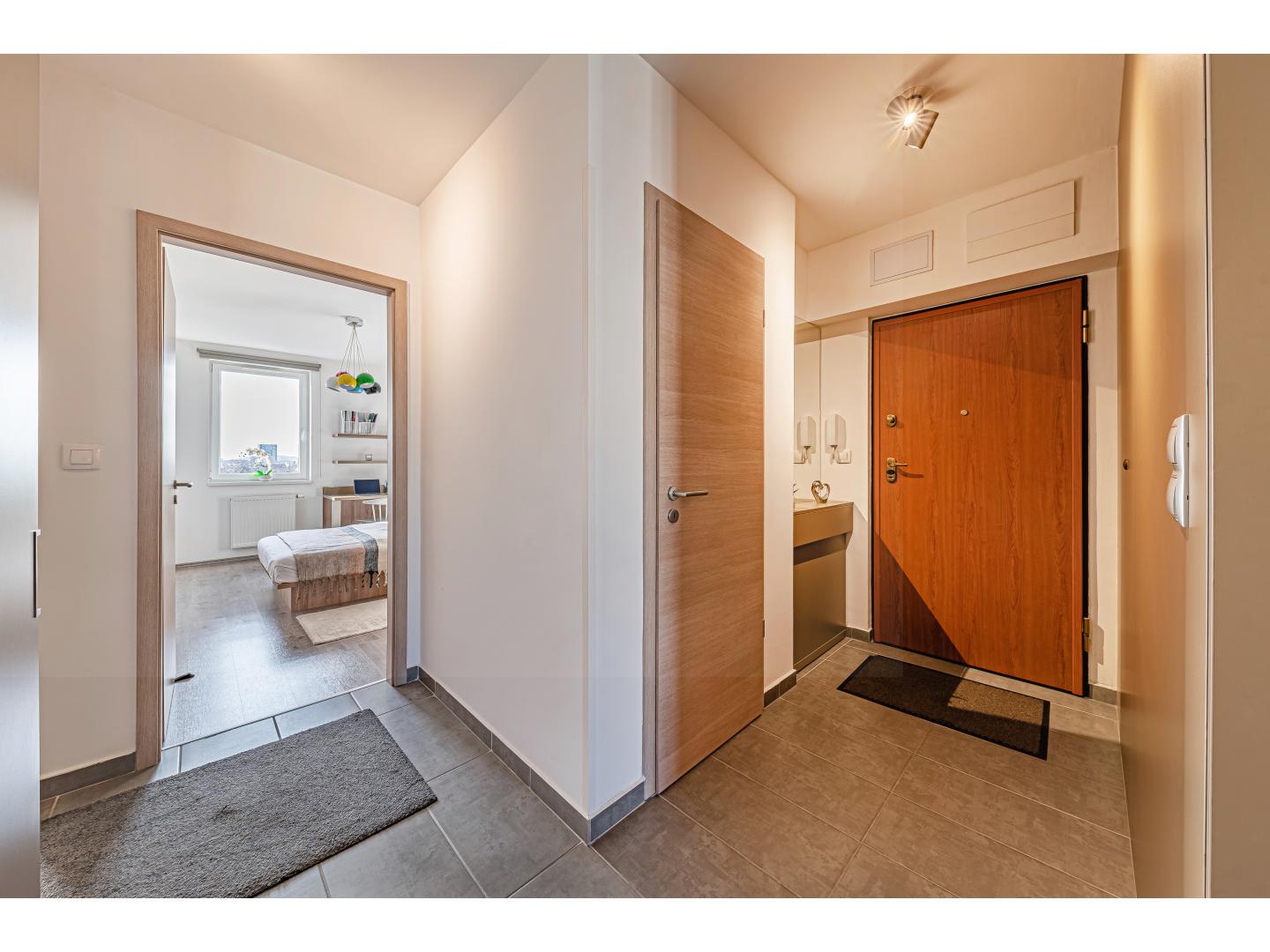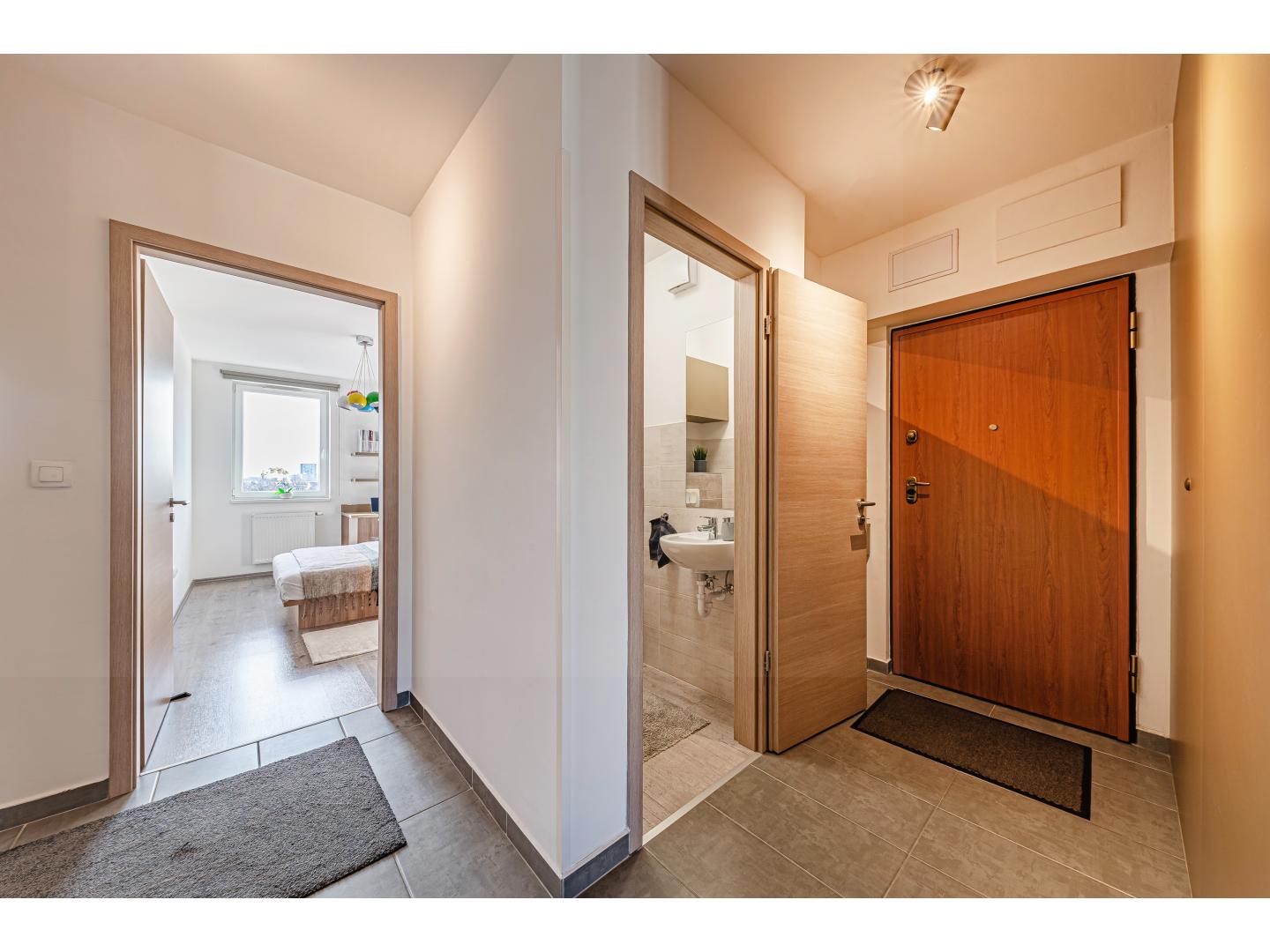 A saját gardróbszekrénnyel rendelkező előszobából külön vendégmosdó is elérhető, ami a mindennapi kényelmet tovább emeli.