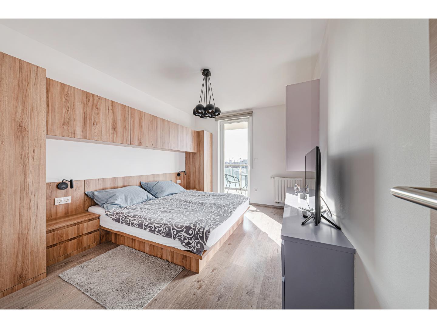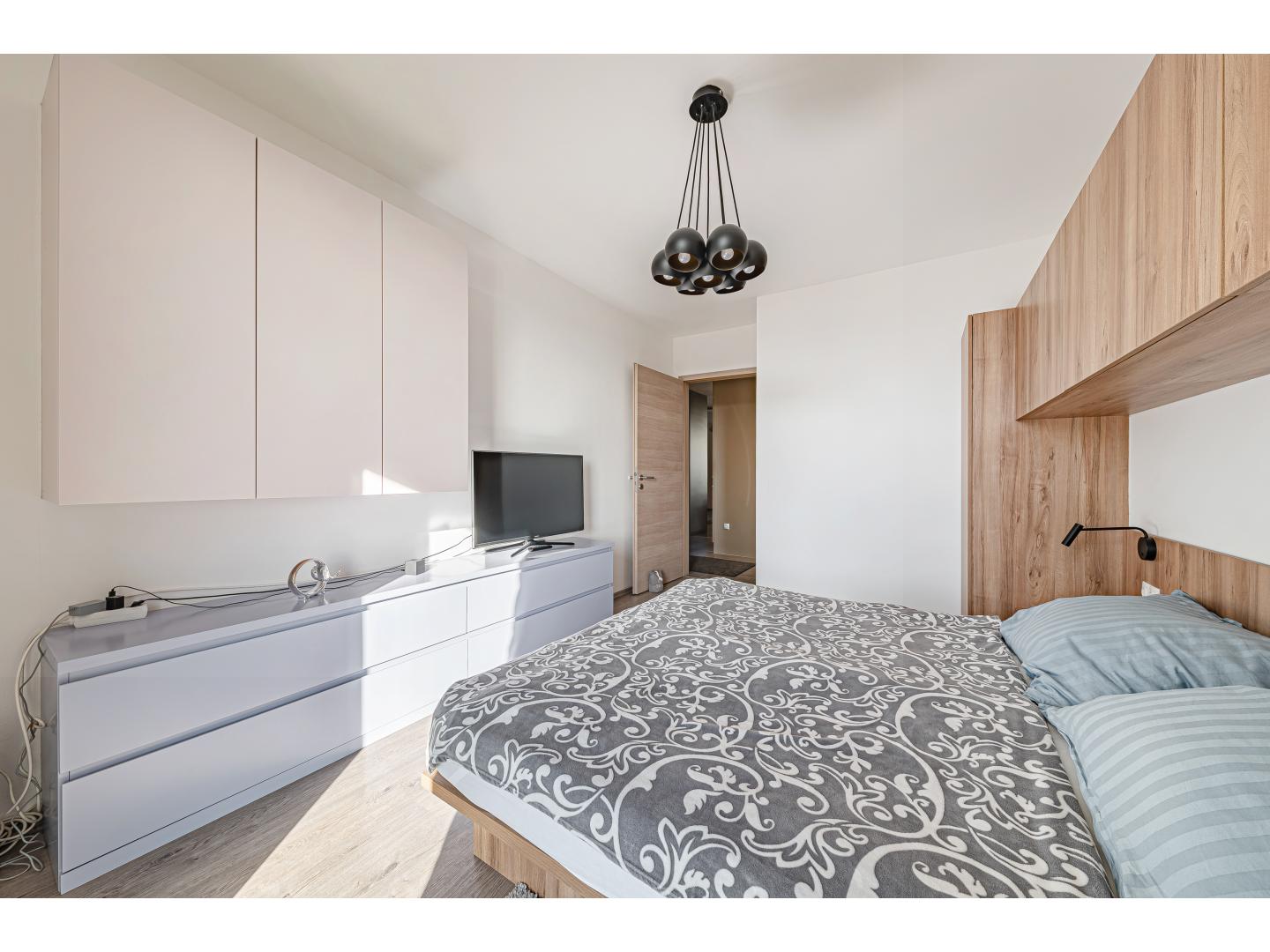 A belső tér kialakítása nemcsak esztétikailag egységes és letisztult, hanem kifejezetten funkcionális is. Az egyedileg, asztalos által gyártott beépített szekrények és rejtett tárolók végigkísérik az egész lakást, így a terek rendezettek, elegánsak és maximálisan kihasználhatók.