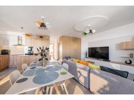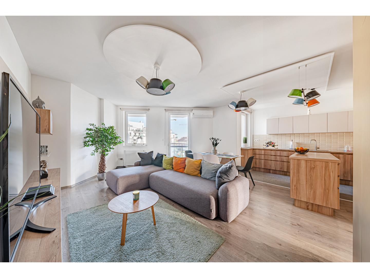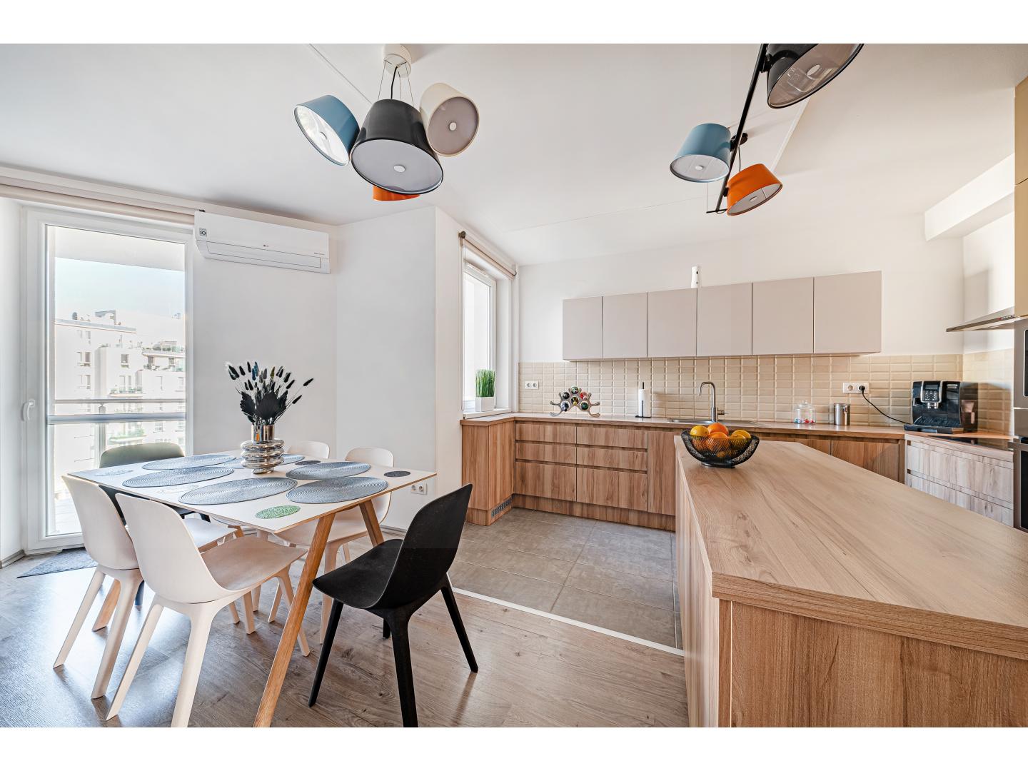 A nappali – étkező térben egy 6 személyes étkező és az „L” alakú, design kanapé kapott helyett az egyedileg gyártott média fal, és a padlótól-plafonig tartó gardrób szekrények mellett. A világításról színes design mennyezeti lámpák gondoskodnak.