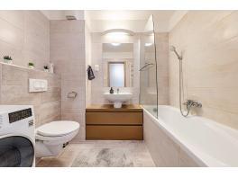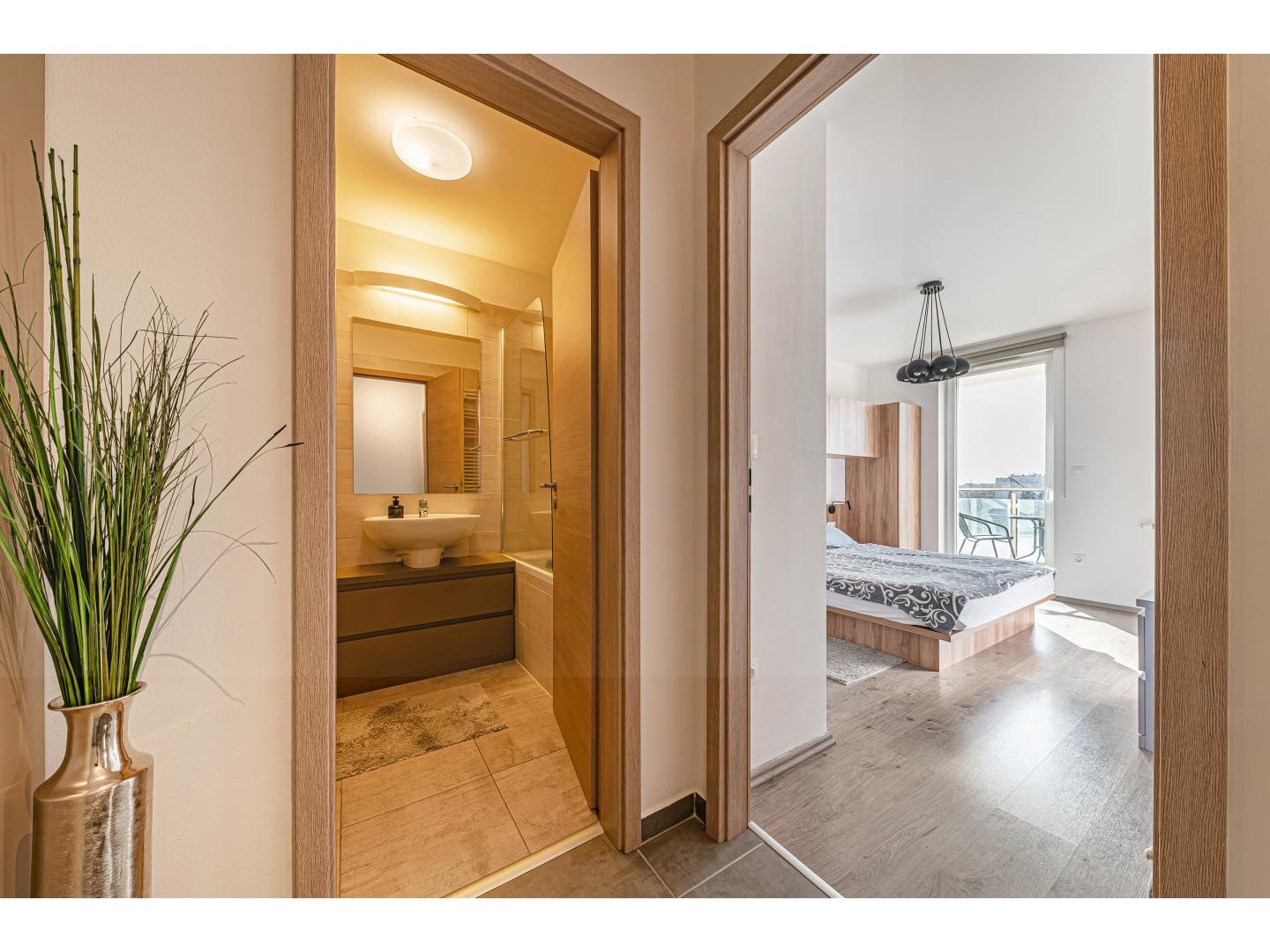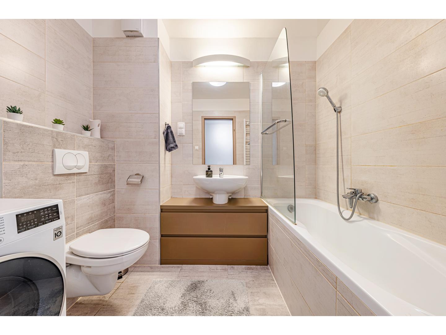 A fürdőszoba kádas kialakítású, zuhanyparavánnal, törölközőszárítós radiátorral és praktikus, fiókos szekrénnyel egybeépített mosdóval. Az előszobából külön vendégmosdó is elérhető, ami a mindennapi kényelmet tovább emeli.