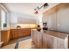 A nappali–étkező–konyha egy légtérben kapott helyet, modern, harmonikus arányokkal. A konyha valódi központi elem: szigetes kialakítású, matt szürke és tölgyfa frontokkal, teljesen gépesítve, főzőlappal, sütőtoronyba épített sütővel, mikrohullámú sütővel, fagyasztós hűtőszekrénnyel, integrált mosogatógéppel és kivezetett, nagy teljesítményű páraelszívóval.