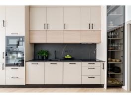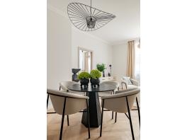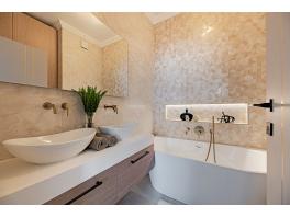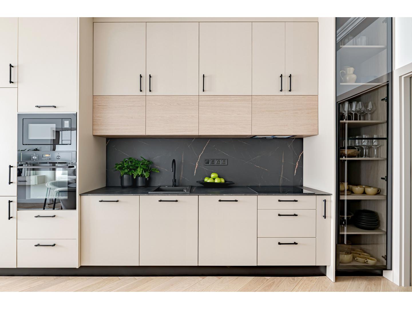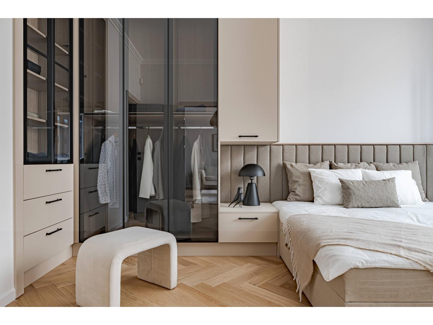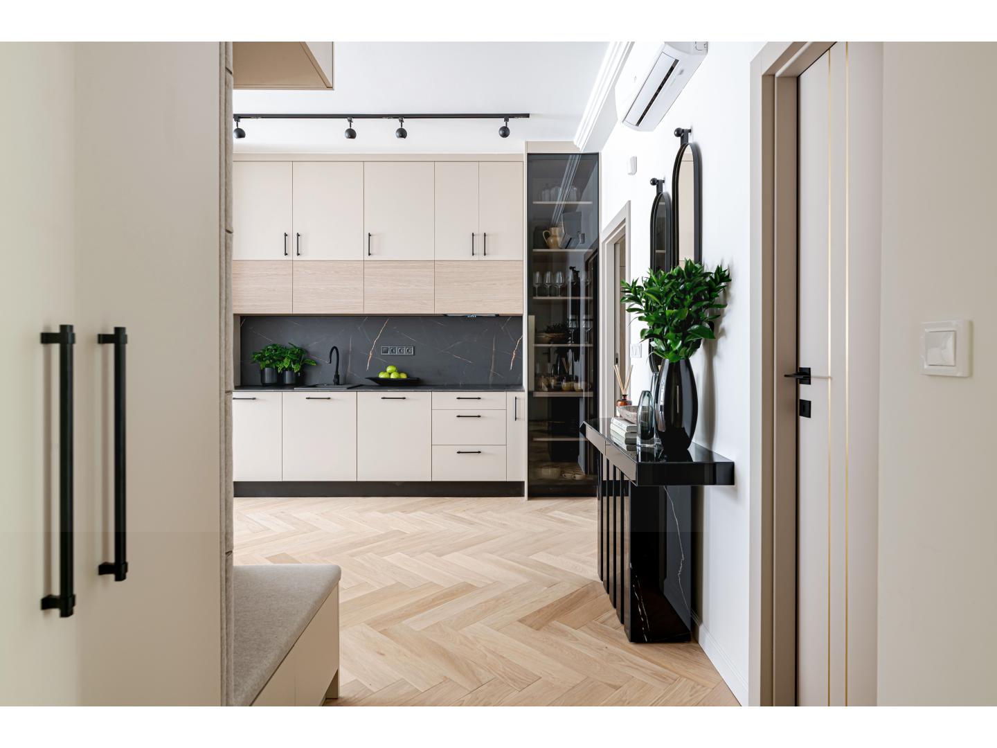 A gondos, jó stílusérzékkel rendelkező tervezésnek köszönhetően a burkolatok és a beépített bútorok tökéletesen harmonizálnak egymással. Szerencsére a dizájn nem ment a praktikum rovására, hiszen minden helyiség rendelkezik megfelelő mennyiségű tárolási lehetőséggel. A nem mindennapos szükségletű holmik tárolásában pedig a ház alagsorában a lakáshoz tartozó tároló nyújt segítséget.