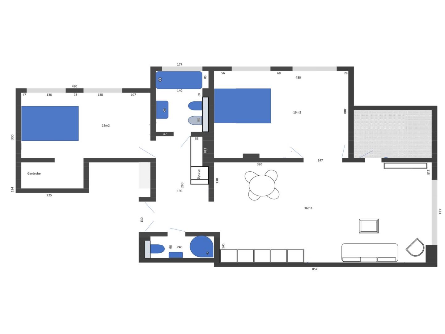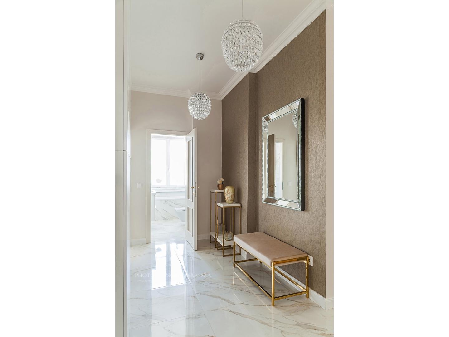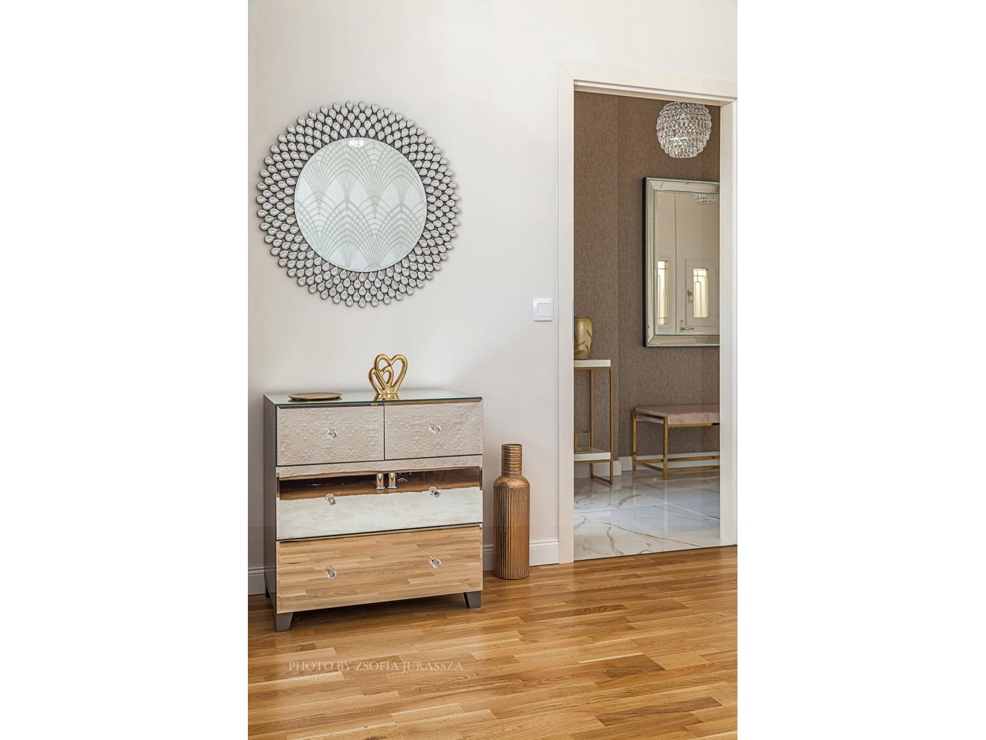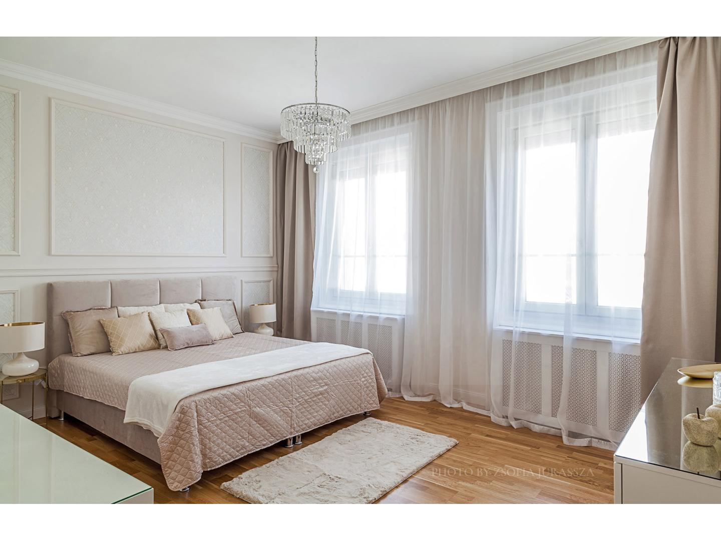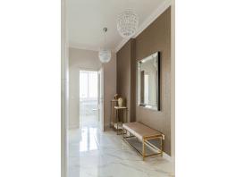 A lakás elrendezése: tágas, amerikai konyhás nappali közvetlen kijárattal a panorámás erkélyre, két nagyméretű hálószoba, külön gardróbszoba, két - káddal, ill. zuhanyzóval felszerelt - fürdőszoba (mindkettő WC-vel), kényelmes, jól használható előszoba.