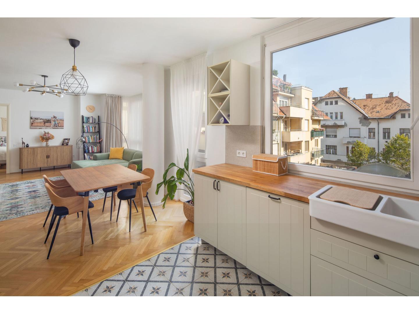 Naphegyen, a Gyetvai fivérek által épített, Zsolt Udvar lakóparkban eladó egy IV. emeleti, 95 négyzetméteres, nappali+2 hálószobás lakás, garázzsal, mely a remek elhelyezkedésnek köszönhetően, ötvözi a jó infrastruktúrát a zöld környezettel, egy biztonságos, portaszolgálatos, csodás belső kerttel rendelkező épület együttesben. Az ingatlan már kivitelezése során is nagyon jó minőséget képviselt, amit a tulajdonosok egy 3 évvel ezelőtti teljeskörű felújítással frissítettek fel. Alaprajzi elrendezése praktikus,élhető otthont nyújt, tágas terekkel. A ház belső kertjének egyik felében játszótér van a gyerekesek számára, a másik fele pedig a pihenni vágyók számára lett kialakítva halastóval, kerti padokkal. A környéken minden megtalálható az élhető mindennapokhoz a bevásárlási lehetőségektől, a sportolási lehetőségeken át, a vendéglátó egységekig. (Aldi, Oxigén Wellness, Czakó kert). Gyerekes családok számára kifejezetten ideális a környék a minőségi játszóterek és a bölcsőde, óvoda, iskola közvetlen elérhetőségéből adódóan. A Tabán és Gellérthegy rövid sétával megközelíthető, így azok számára is ideális akiknek fontos a természet közeli kikapcsolódás.