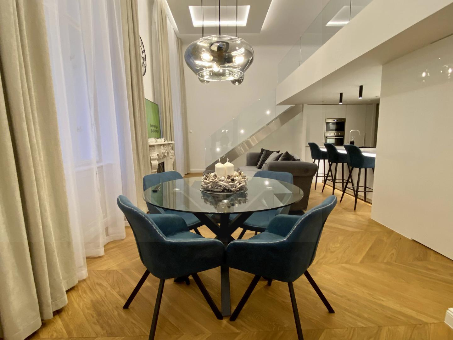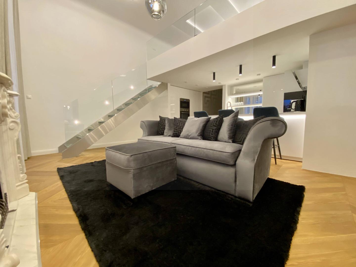Az Andrássy úttól séta távolságra elhelyezkedő, I. emeleti lakás, 4,2 méteres belmagassága lehetővé tette, hogy egy 17 négyzetméteres galériával növeljék meg az életteret. 63 m2+17 m2 galéria (1,90 m feletti belmagasság) nappali, konyha, étkező+ 1 hálószoba saját fürdővel + 1 hálószoba (galéria)+ 1 fürdőszoba + mosókonyha + bőrönd tároló kialakítású.